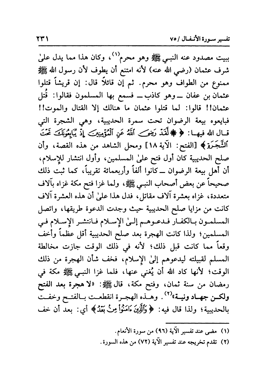 ببيت مصدود عنه النبي صلى الله عليه وسلم وهو محرم (¬١)، وكان هذا مما يدل على شرف عثمان (رضي الله عنه) لأنه امتنع أن يطوف؛ لأن رَسُول الله صلى الله عليه وسلم ممنوع من الطواف وهو محرم. ثم إن قائلاً قال: إن قريشاً قتلوا عثمان بن عفان -وهو كاذب- فسمع بها المسلمون فقالوا: قُتِلَ عثمان!! قالوا: لما قتلوا عثمان ما هنالك إلا القتال والموت!! فبايعوه بيعة الرضوان تحت سمرة الحديبية، وهي الشجرة التي قال الله فيها: {لَقَدْ رَضِيَ اللَّهُ عَنِ الْمُؤْمِنِينَ إِذْ يُبَايِعُونَكَ تَحْتَ الشَّجَرَةِ} [الفتح: الآية ١٨] ومحل الشاهد من هذه القصة، وأن صلح الحديبية كان أول فتح على المسلمين، وأول انتشار للإسلام، أن أهل بيعة الرضوان كانوا ألفًا وأربعمائة تقريباً، كما ثَبَتَ ذَلِكَ صَحِيحاً عن بعض أصحاب النبي صلى الله عليه وسلم، ولما غَزَا فتح مكة غزاه بآلاف متعددة، غزاه بعشرة آلاف مقاتل، فدل هذا على أن هذه العشرة الآلاف كانت من مزايا صلح الحديبية حيث وجدت الدعوة طريقها، واتصل المسلمون بالكفار فَدَعَوْهُمْ إلى الإسلام فانتشر الإسلام في المسلمين؛ ولذا كانت الهجرة بعد صلح الحديبية أقل عظماً وأخف وقعاً مما كانت قبل ذلك؛ لأنه في ذلك الوقت جازت مخالطة المسلم لقبيلته ليدعوهم إلى الإسلام، فخف شأن الهجرة من ذلك الوقت؛ لأنها كاد الله أن يُغني عنها، فلما غزا النبي صلى الله عليه وسلم مكة في رمضان من سنة ثمان، وفتح مكة، قال: «لَا هِجْرَةَ بَعْدَ الْفَتْحِ وَلَكِنْ جِهَادٌ وَنِيَّةٌ» (¬٢). وهذه الهجرة انقطعت بالفتح وخفت بالحديبية؛ ولذا قال فيه: {وَالَّذِينَ آمَنُواْ مِن بَعْدُ} أي: بعد أن خف