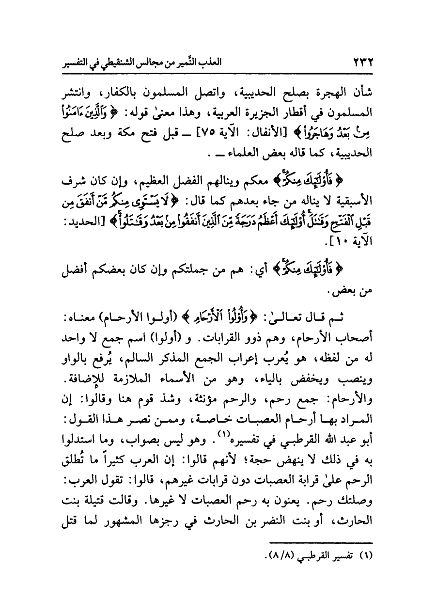 ثم قال تعالى: {وَأُوْلُواْ الأَرْحَامِ} (أولوا الأرحام) معناه: أصحاب الأرحام، وهم ذوو القرابات. و (أولوا) اسم جمع لا واحد له من لفظه، هو يُعرب إعراب الجمع المذكر السالم، يرفع بالواو وينصب ويخفض بالياء، وهو من الأسماء الملازمة للإضافة. والأرحام: جمع رحم، والرحم مؤنثة، وشذ قوم هنا وقالوا: إن المراد بها أرحام العصبات خاصة، وممن نصر هذا القول: أبو عبد الله القُرْطُبِي في تفسيره (¬١). وهو ليس بصواب، وما استدلوا به في ذلك لا ينهض حجة؛ لأنهم قالوا: إن العرب كثيراً ما تُطلق الرحم على قرابة العصبات دون قرابات غيرهم، قالوا: تقول العرب: وصلتك رحم. يعنون به رحم العصبات لا غيرها. وقالت قتيلة بنت الحارث، أو بنت النضر بن الحارث في رجزها المشهور لما قتل