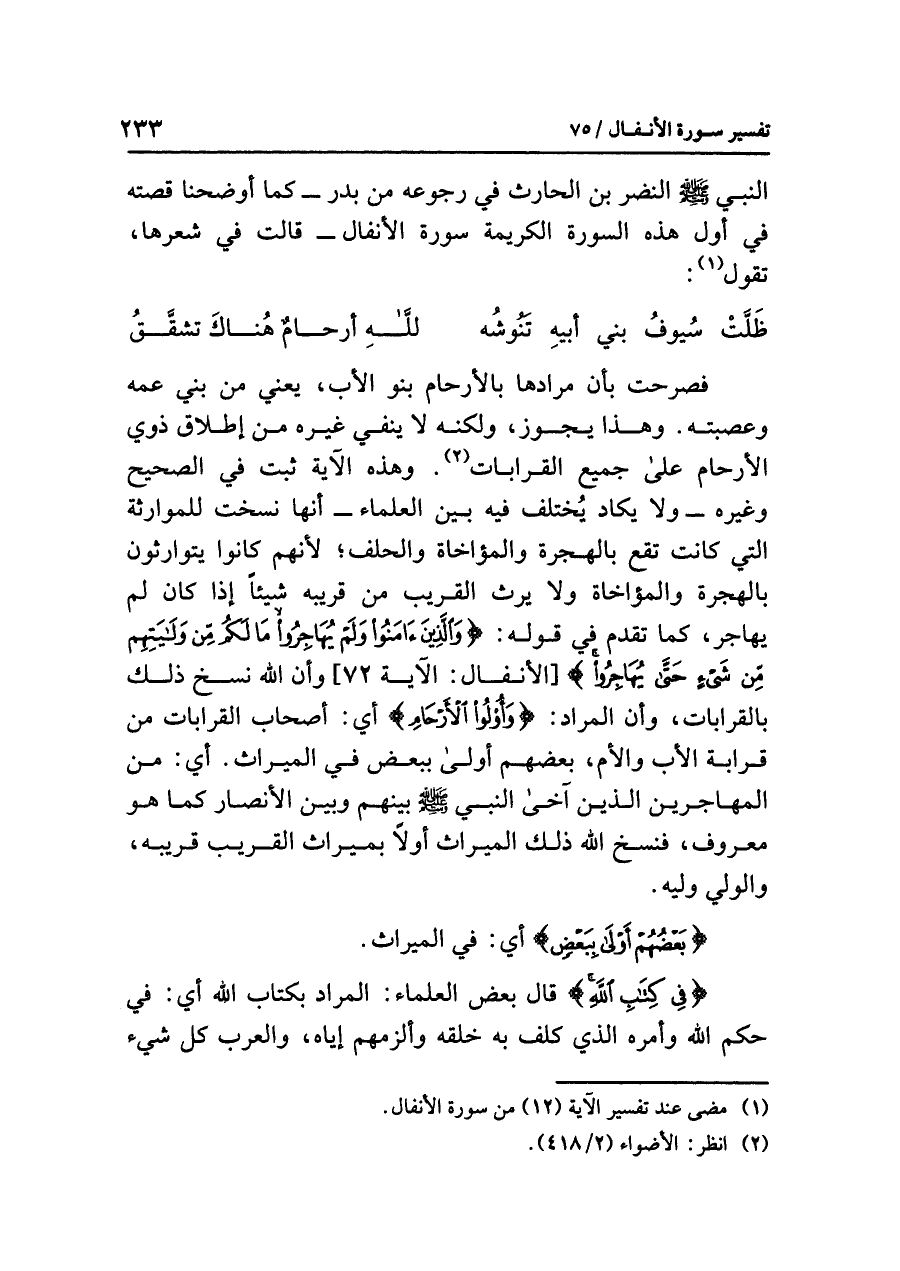 فصرحت بأن مرادها بالأرحام بنو الأب، يعني مِنْ بَنِي عَمِّهِ وعَصَبَتِهِ. وهذا يجوز، ولكنه لا ينفي غَيْرَهُ مِنْ إِطْلاق ذوي الأرحام على جميع القَرَابَات (¬٢). وهذه الآية ثبت في الصحيح وغيره -ولا يكاد يُخْتَلَفُ فِيهِ بَيْنَ العُلَمَاءِ- أنها نسخت للموارثة التي كانت تقع بالهجرة والمؤاخاة والحلف؛ لأنهم كانوا يتوارثون بالهجرة والمؤاخاة ولا يرث القريب من قريبه شيئاً إذا كان لم يهاجر، كما تقدم في قوله: {وَالَّذِينَ آمَنُواْ وَلَمْ يُهَاجِرُواْ مَا لَكُم مِّن وَلَايَتِهِم مِّن شَيْءٍ حَتَّى يُهَاجِرُواْ} [الأنفال: الآية ٧٢] وأن الله نسخ ذلك بالقرابات، وأن المراد: {وَأُوْلُواْ الأَرْحَامِ} أي: أصحاب القرابات من قرابة الأب والأم، بعضهم أولى ببعض في الميراث؛ أي: من المهاجرين الذين آخى النبي صلى الله عليه وسلم بينهم وبين الأنصار كما هو معروف، فنسخ الله ذلك الميراث أولاً بميراث القريب قريبه، والولي وليه.