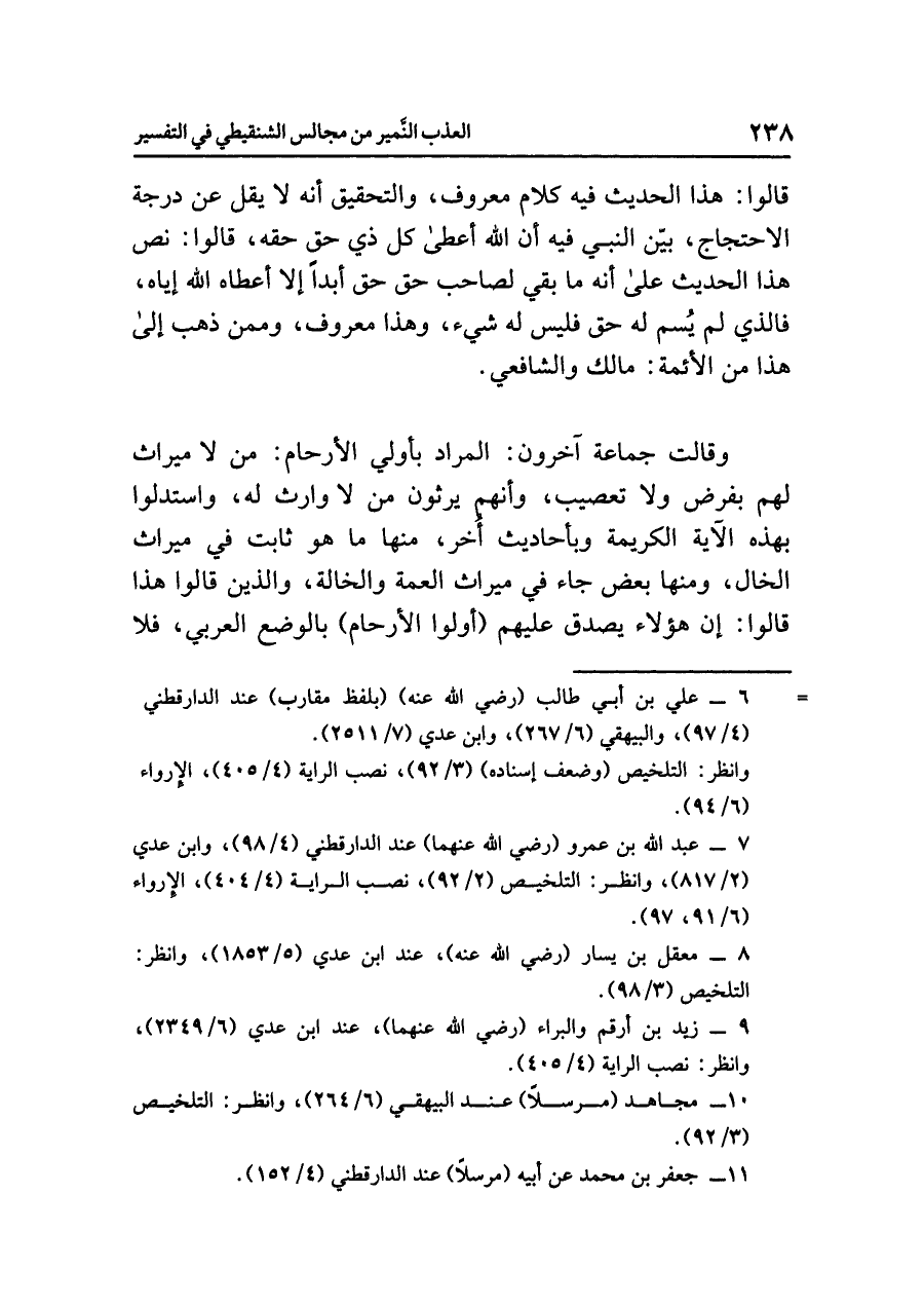 قالوا: هذا الحديث فيه كلام معروف، والتحقيق أنه لا يقل عن درجة الاحتجاج، بيّن النبي فيه أن الله أعطى كل ذي حق حَقَّهُ، قالوا: نص هذا الحديث على أنَّهُ مَا بَقِيَ لصاحب حقٍّ حَقٌّ أبداً إلا أعطاه الله إيَّاهُ، فالَّذِي لم يُسَمَّ لَهُ حق فليس له شيء، وهذا معروف، وممن ذَهَب إلى هذا من الأئمة: مالك والشافعي.