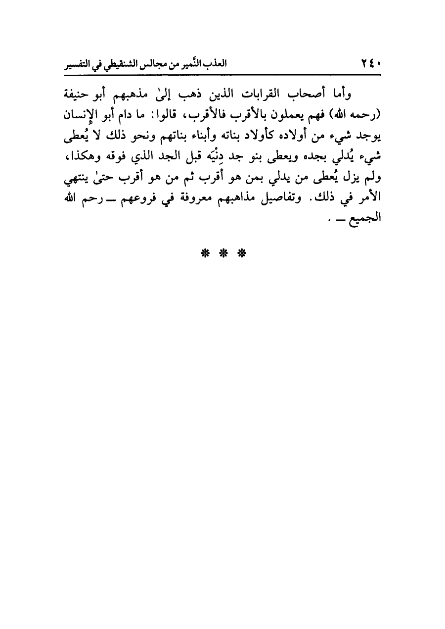 وأما أصحاب القرابات الذين ذهب إلى مذهبهم أبو حنيفة (رحمه الله) فهم يعملون بالأقرب فالأقرب، قالوا: ما دام أبو الإنسان يوجد شيء من أولاده كأولاد بناته وأبناء بناتهم ونحو ذلك لا يعطى شيء يدلي بجده ويعطى بنو جد دنيه قبل الجد الذي فوقه وهكذا، ولم يزل يُعطى من يدلي بمن هو أقرب ثم من هو أقرب حتى ينتهي الأمر في ذلك. وتفاصيل مذاهبهم معروفة في فروعهم، رحم الله الجميع.