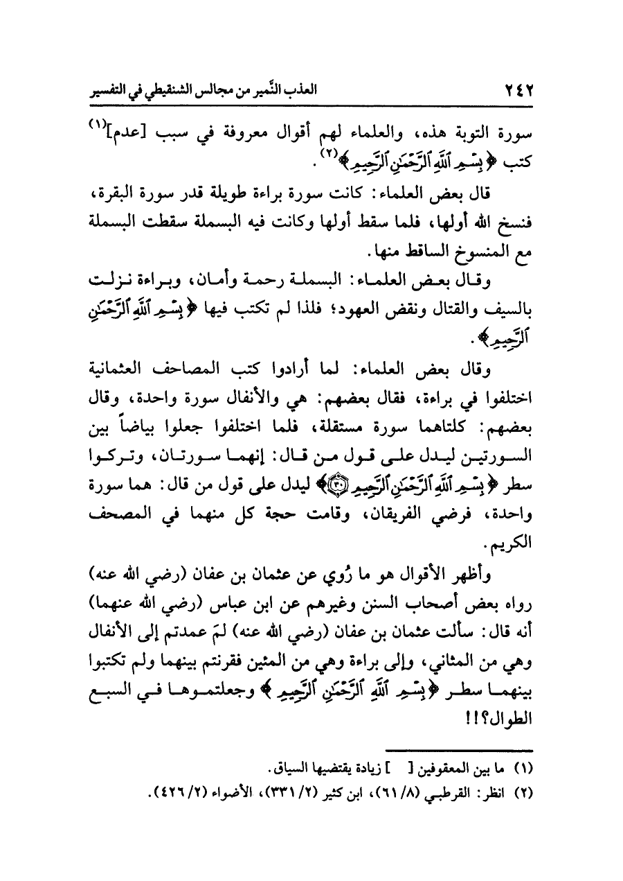 وأظهر الأقوال هو ما روي عن عثمان بن عفان (رضي الله عنه) رواه بعض أصحاب السنن وغيرهم عن ابن عباس (رضي الله عنهما) أنه قال: سألت عثمان بن عفان (رضي الله عنه) لمَ عمدتم إلى الأنفال وهي من المثاني، وإلى براءة وهي من المئين فقرنتم بينهما ولم تكتبوا بينهما سطر {بِسْمِ اللهِ الرَّحْمنِ الرَّحِيمِ} وجعلتموها في السبع الطوال؟!