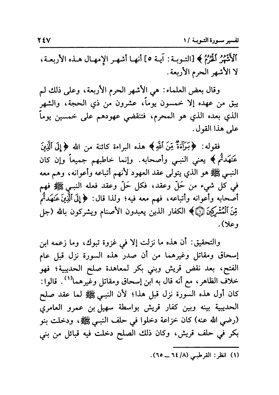 والتحقيق: أن هذه ما نزلت إلا في غزوة تبوك، وما زعمه ابن إسحاق ومقاتل وغيرهما من أن صدر هذه السورة نزل قبل عام الفتح، بعد نقض قريش وبني بكر لمعاهدة صلح الحديبية؛ فهو خلاف الظاهر، مع أنه قال به ابن إسحاق ومقاتل وغيرهما (¬١). قالوا: كان أول هذه السورة نزل قبل هذا؛ لأن النبي صلى الله عليه وسلم لما عقد صلح الحديبية بينه وبين كفار قريش بواسطة سهيل بن عمرو العامري (رضي الله عنه) كان خزاعة دخلوا في حلف النبي صلى الله عليه وسلم، ودخلت بنو بكر في حلف قريش، وكان ذلك الصلح دخلت فيه قبائل من بني