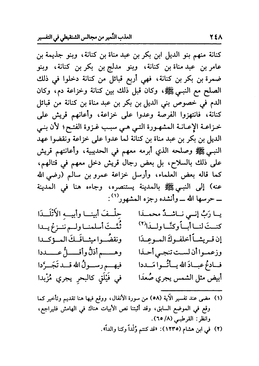 كنانة منهم بنو الديل ابن بكر بن عبد مناة بن كنانة، وبنو جذيمة بن عامر بن عبد مناة بن كنانة، وبنو مدلج بن بكر بن كنانة، وبنو ضمرة بن بكر بن كنانة، فهي أربع قبائل من كنانة دخلوا في ذلك الصلح مع النبي صلى الله عليه وسلم، وكان قبل ذلك بين كنانة وخزاعة دم، وكان الدم في خصوص بني الديل بن بكر بن عبد مناة بن كنانة من قبائل كنانة، فانتهزوا الفرصة وعدوا على خزاعة، وأعانهم قريش على خزاعة الإعانة المشهورة التي هي سبب غزوة الفتح؛ لأن بني الديل بن بكر بن عبد مناة بن كنانة لما عدوا على خزاعة ونقضوا عهد النبي صلى الله عليه وسلم وصلحه الذي أبرمه معهم في الحديبية، وأعانتهم قريش على ذلك بالسلاح، بل بعض رجال قريش دخل معهم في قتالهم، كما قاله بعض العلماء، وأرسل خزاعة عمرو بن سالم (رضي الله عنه) إلى النبي صلى الله عليه وسلم بالمدينة يستنصره، وجاءه هنا في المدينة - حرسها الله - وأنشده رجزه المشهور (¬١):