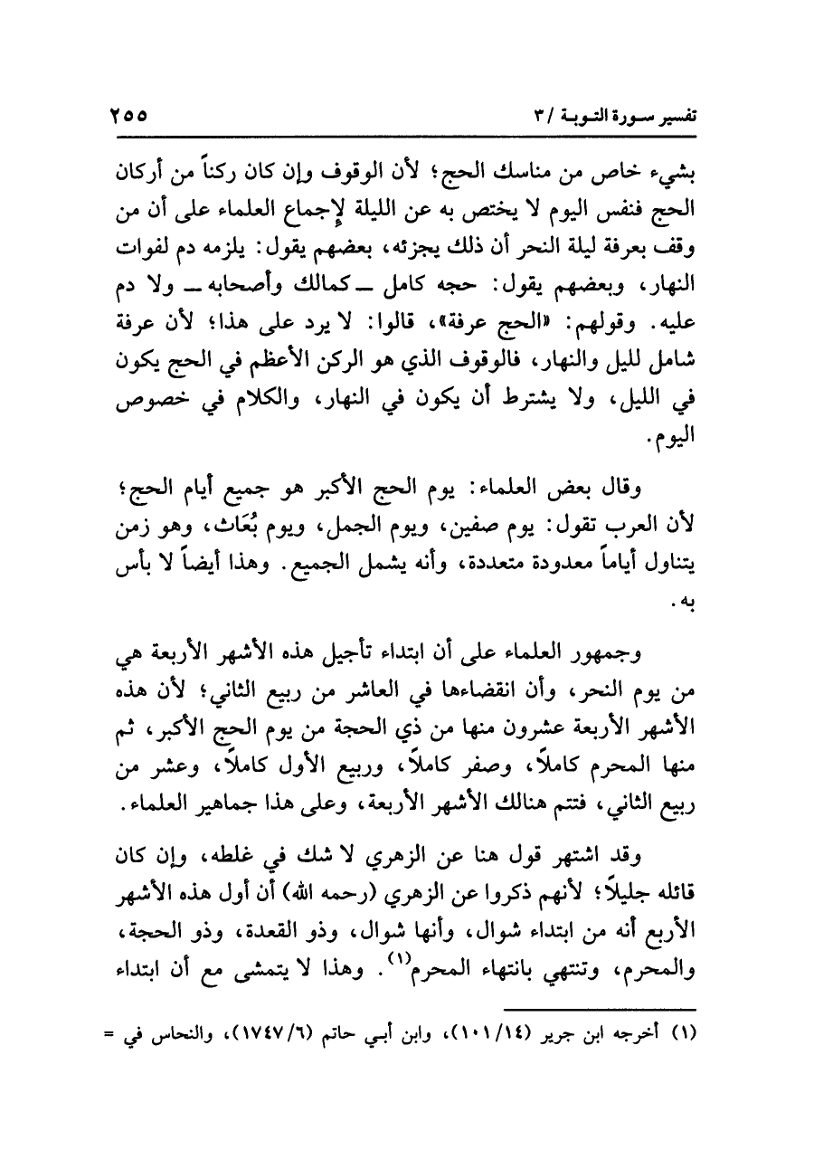وقد اشتهر قول هنا عن الزهري لا شَكَّ فِي غَلَطِهِ، وإن كان قائله جَلِيلاً؛ لأنهم ذكروا عن الزهري (رحمه الله) أن أول هذه الأشهر الأربع أنه من ابتداء شوال، وأنها شوال، وذو القعدة، وذو الحجة، والمحرم، وتنتهي بانتهاء المحرم (¬١). وهذا لا يتمشى مع أن ابتداء