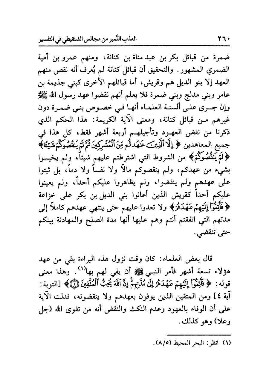 من قبائل بكر بن عبد مناة بن كنانة، ومنهم عمرو بن أمية الضمري المشهور. والتحقيق أن قبائل كنانة لم يُعرف أنه نقض منهم العهد إلا بنو الديل هم وقريش، أما قبائلهم الأخرى كَبَنِي جذيمة بن عامر وبني مدلج وبني ضمرة فلا يعلم أنهم نقضوا عَهْدَ رَسُول الله صلى الله عليه وسلم وإن جرى على ألسنة العلماء أنها في خصوص بني ضمرة دون غيرهم من قبائل كنانة، ومعنى الآية الكريمة: هذا الحكم الذي ذكرنا من نقض العهود وتأجيلهم أربعة أشهر فقط، كل هذا في جميع المعاهدين {إِلَاّ الَّذِينَ عَاهَدتُّم مِّنَ الْمُشْرِكِينَ ثُمَّ لَمْ يَنقُصُوكُمْ شَيْئاً} {لَمْ يَنقُصُوكُمْ} من الشروط التي اشترطتم عليهم شيئاً، ولم يخيسوا بشيء من عهدكم، ولم ينقصوكم مالاً ولا نفساً ولا دماً، بل ثَبَتُوا على عهدهم ولم ينقضوا، ولم يظاهروا عليكم أحداً، ولم يعينوا عليكم أحداً كقريش الذين أعانوا بني الديل بن بكر على خزاعة {فَأَتِمُّواْ إِلَيْهِمْ عَهْدَهُمْ} ولا تعدوا عليهم حتى ينتهي عهدهم كاملاً إلى مدتهم التي اتفقتم أنتم وهم عليها أنها مدة الصلح والمهادنة بينكم حتى تنقضي.