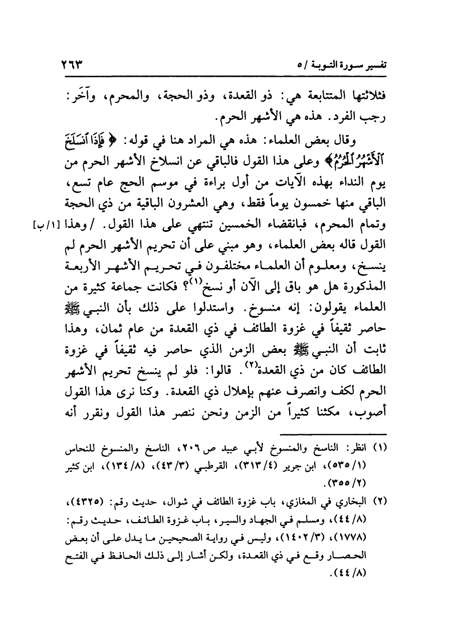 وقال بعض العلماء: هذه هي المراد هنا في قوله: {فَإِذَا انسَلَخَ الأَشْهُرُ الْحُرُمُ} وعلى هذا القول فالباقي عن انسلاخ الأشهر الحرم من يوم النداء بهذه الآيات من أول براءة في موسم الحج عام تسع، الباقي منها خمسون يوماً فقط، وهي العشرون الباقية من ذي الحجة [١/ب] وتمام المحرم، فبانقضاء الخمسين تنتهي على هذا القول./ وهذا القول قاله بعض العلماء، وهو مبني على أن تحريم الأشهر الحرم لم ينسخ، ومعلوم أن العلماء مختلفون في تحريم الأشهر الأربعة المذكورة هل هو باق إلى الآن أو نسخ (¬١)؟ فكانت جماعة كثيرة من العلماء يقولون: إنه منسوخ. واستدلوا على ذلك بأن النبي صلى الله عليه وسلم حاصر ثقيفاً في غزوة الطائف في ذي القعدة من عام ثمان، وهذا ثابت أن النبي صلى الله عليه وسلم بعض الزمن الذي حاصر فيه ثقيفاً في غزوة الطائف كان من ذي القعدة (¬٢). قالوا: فلو لم ينسخ تحريم الأشهر الحرم لكف وانصرف عنهم بإهلال ذي القعدة. وكنا نرى هذا القول أَصْوَبَ، مكثنا كثيراً من الزمن ونحن ننصر هذا القول ونقرر أنه