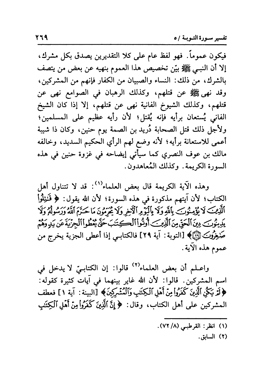 فيكون عموماً، فهو لفظ عام على كلا التَّقْدِيرَيْنِ يصدق بكل مشرك، إلا أن النبي صلى الله عليه وسلم بيّن تخصيص هذا اليوم بنهيه عن بعض مَنْ يَتَّصِفُ بالشرك، من ذلك: النساء والصبيان من الكفار فإنهم من المشركين، وقد نهى صلى الله عليه وسلم عن قتلهم، وكذلك الرهبان في الصوامع نهى عن قتلهم، وكذلك الشيوخ الفانية نهى عن قتلهم، إلا إذا كان الشيخ الفاني يُستعان برأيه فإنه يُقتل؛ لأن رأيه عظيم على المسلمين؛ ولأجل ذلك قتل الصحابة دُريد بن الصمة يوم حنين، وكان ذا شيبة أعمى للاستعانة برأيه؛ لأنه وضع لهم الرأي الحكيم السديد، وخالفه مالك بن عوف النصري كما سيأتي إيضاحه في غزوة حنين في هذه السورة الكريمة. وكذلك المُعاهدون.