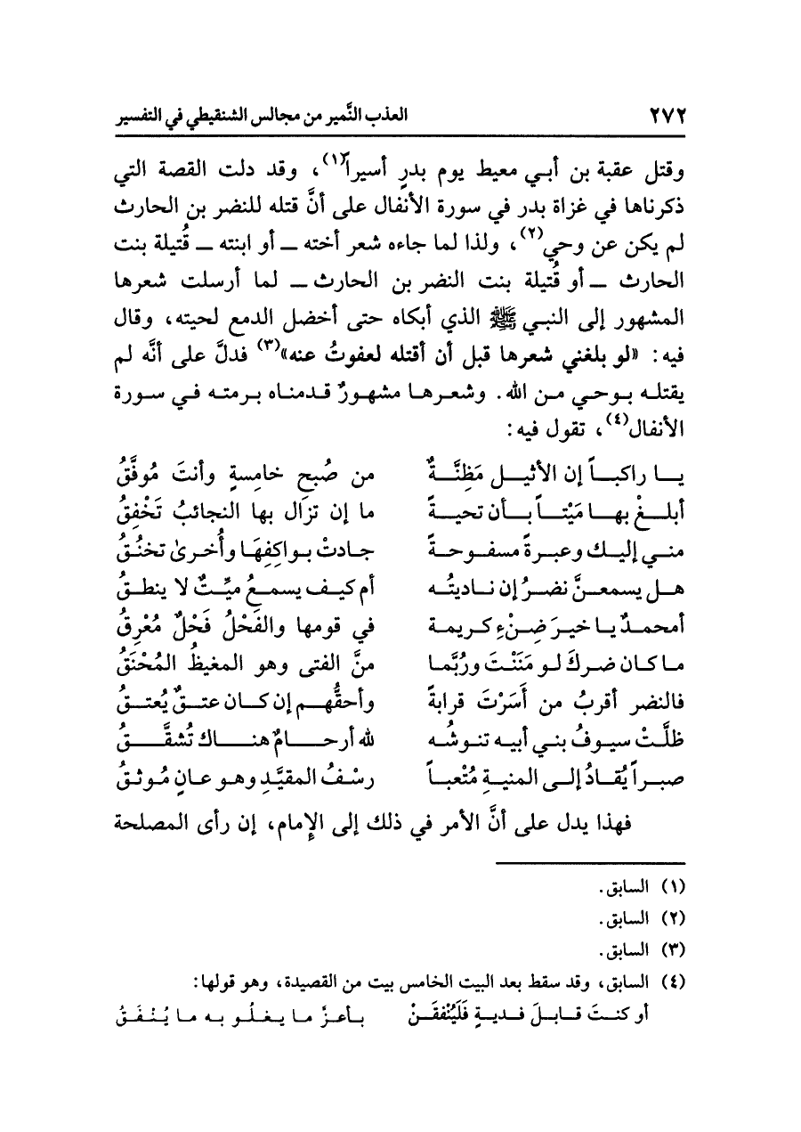 وقتل عقبة بن أبي معيط يوم بدرٍ أسيراً (¬١)، وقد دلت القصة التي ذكرناها في غزاة بدر في سورة الأنفال على أنَّ قَتْلَهُ للنَّضْرِ بن الحارث لم يكن عن وَحْي (¬٢)، ولذا لما جاءه شعر أخته -أو ابنته- قُتيلة بنت الحارث -أو قُتيلة بنت النضر بن الحارث- لما أرسلت شعرها المشهور إلى النبي صلى الله عليه وسلم الذي أبكاه حتى أخضل الدمع لحيته، وقال فيه: «لو بَلَغَنِي شِعْرُهَا قَبْلَ أَنْ أَقْتُلَهُ لَعَفَوْتُ عَنْهُ» (¬٣) فدلَّ على أنَّه لم يقتله بوحي من الله. وشعرها مشهورٌ قَدَّمْنَاه برمته في سورة الأنفال (¬٤)، تقول فيه: