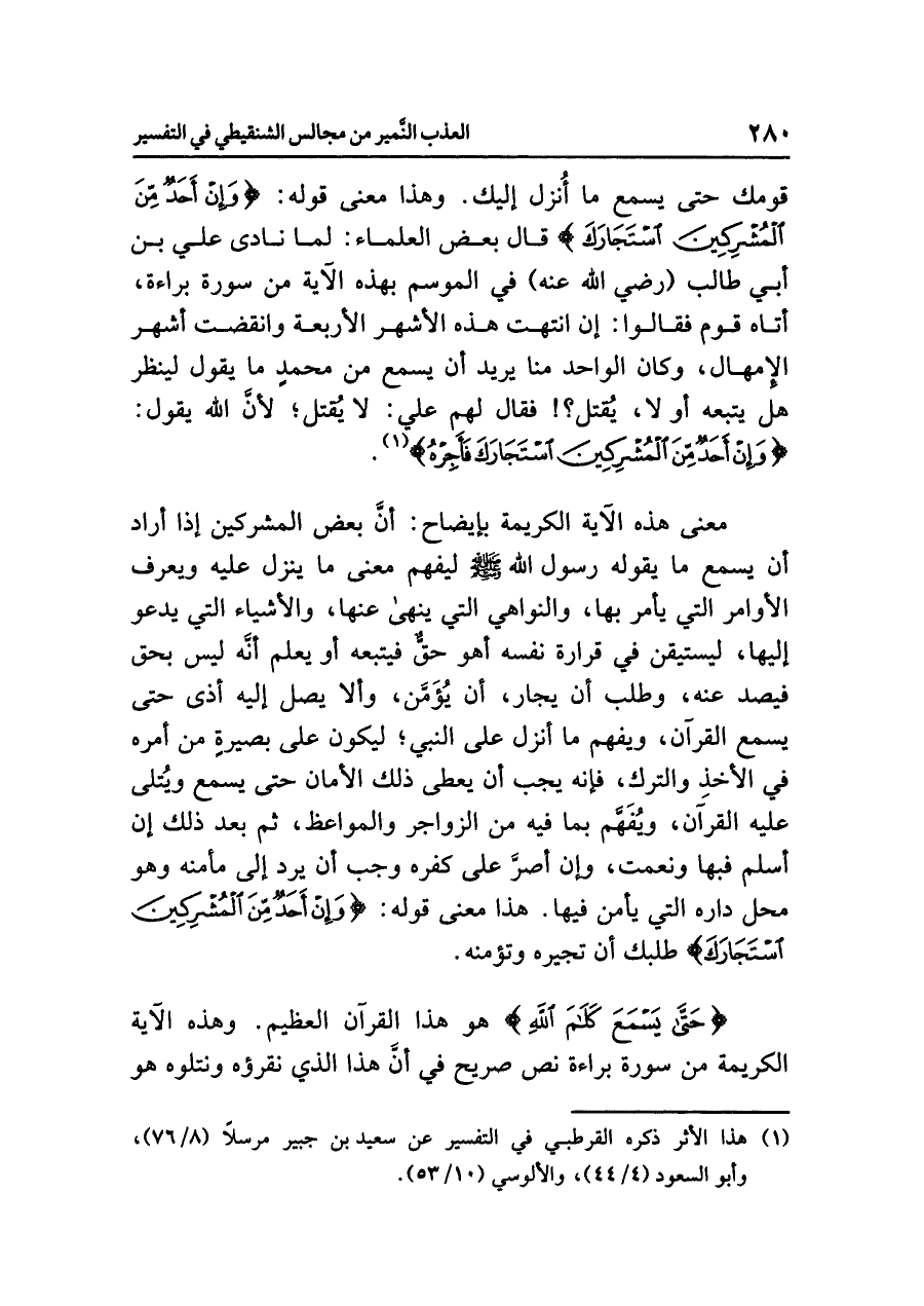 قَوْمِكَ حتى يسمع ما أُنزل إليك. وهذا معنى قوله: {وَإِنْ أَحَدٌ مِّنَ الْمُشْرِكِينَ اسْتَجَارَكَ} قال بعض العلماء: لما نادى علي بن أبي طالب (رضي الله عنه) في الموسم بهذه الآية من سورة براءة، أتاه قوم فقالوا: إن انتهت هذه الأشهر الأربعة وانقضت أشهر الإِمْهَال، وكان الواحد منا يريد أن يسمع من محمدٍ ما يقول لينظر هل يتبعه أو لا، يُقتل؟! فقال لهم علي: لا يُقتل؛ لأنَّ الله يقول: {وَإِنْ أَحَدٌ مِّنَ الْمُشْرِكِينَ اسْتَجَارَكَ فَأَجِرْهُ} (¬١).