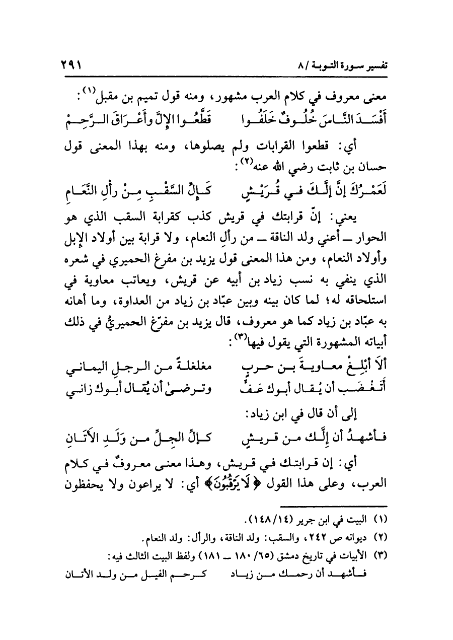 يعني: إنّ قرابتك في قريش كذب كقرابة السقب الذي هو الحوار -أعني ولد الناقة- من رألِ النعام، ولا قرابة بين أولاد الإبل وأولاد النعام، ومن هذا المعنى قول يزيد بن مفرغ الحميري في شعره الذي ينفي به نسب زياد بن أبيه عن قريش، ويعاتب معاوية في استلحاقه له؛ لما كان بينه وبين عبّاد بن زياد من العداوة، وما أهانه به عبّاد بن زياد كما هو معروف، قال يزيد بن مفرّغ الحميريُّ في ذلك أبياته المشهورة التي يقول فيها (¬٣):