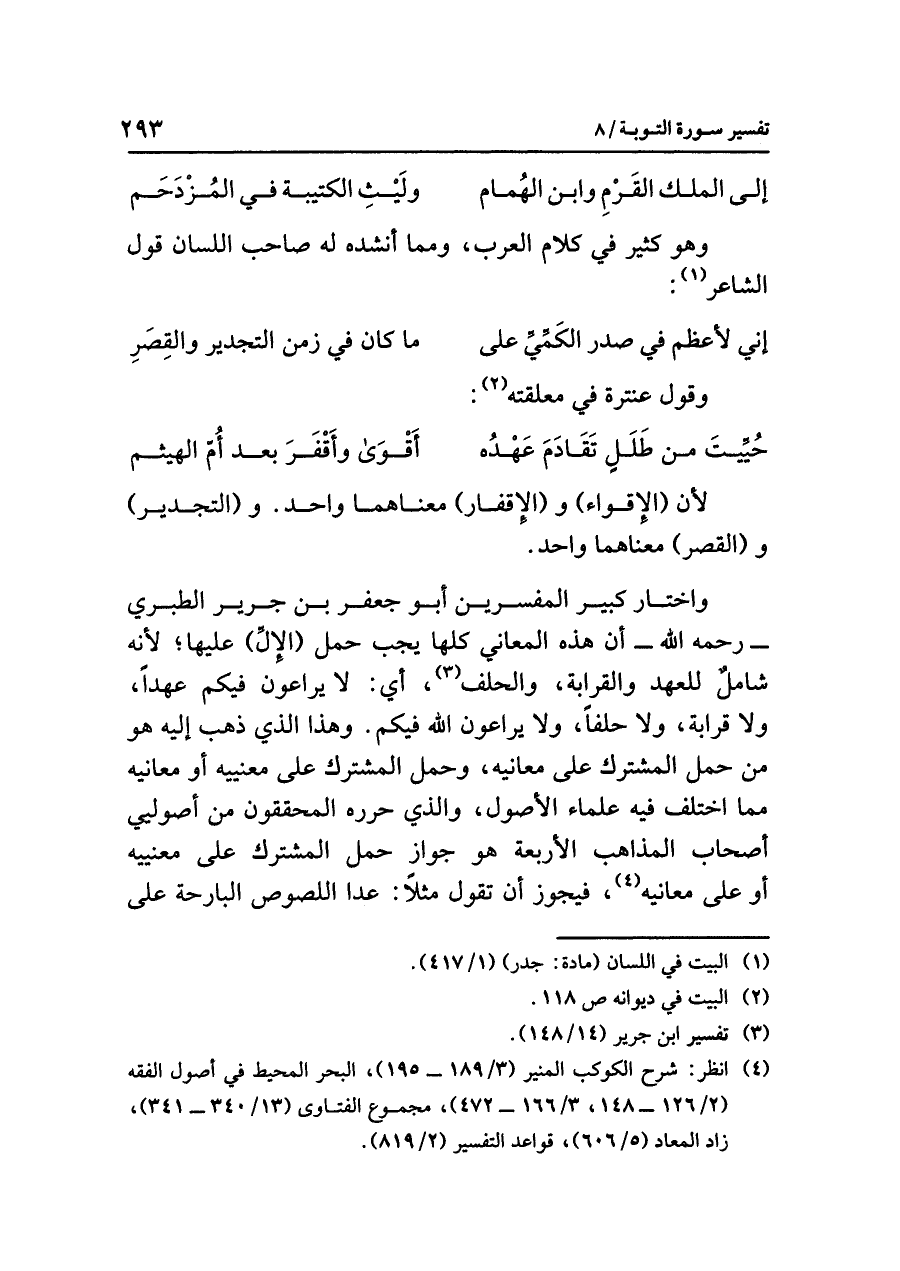 واختار كبير المفسرين أبو جعفر بن جرير الطبري -رحمه الله- أن هذه المعاني كلها يجب حمل (الإلِّ) عليها؛ لأنه شاملٌ لِلْعَهْدِ والقرابة، والحلف (¬٣)؛ أي: لا يُرَاعُونَ فِيكُمْ عَهْداً، ولا قرابة، ولا حلفاً، ولا يُرَاعُونَ اللهَ فِيكُمْ. وهَذَا الذي ذهب إليه هو مِنْ حَمْلِ المُشْتَركِ على مَعَانيه، وحمل المشترك على معنييه أو معانيه مما اخْتَلَفَ فِيهِ عُلَماء الأصُول، والذي حَرَّرَهُ المحققون من أصوليي أصحاب المذاهب الأربعة هو جواز حمل المشترك على مَعْنَيَيْهِ أو معانيه (¬٤)، فيجوز أن تقول مثلاً: عدا اللصوص البارحة على