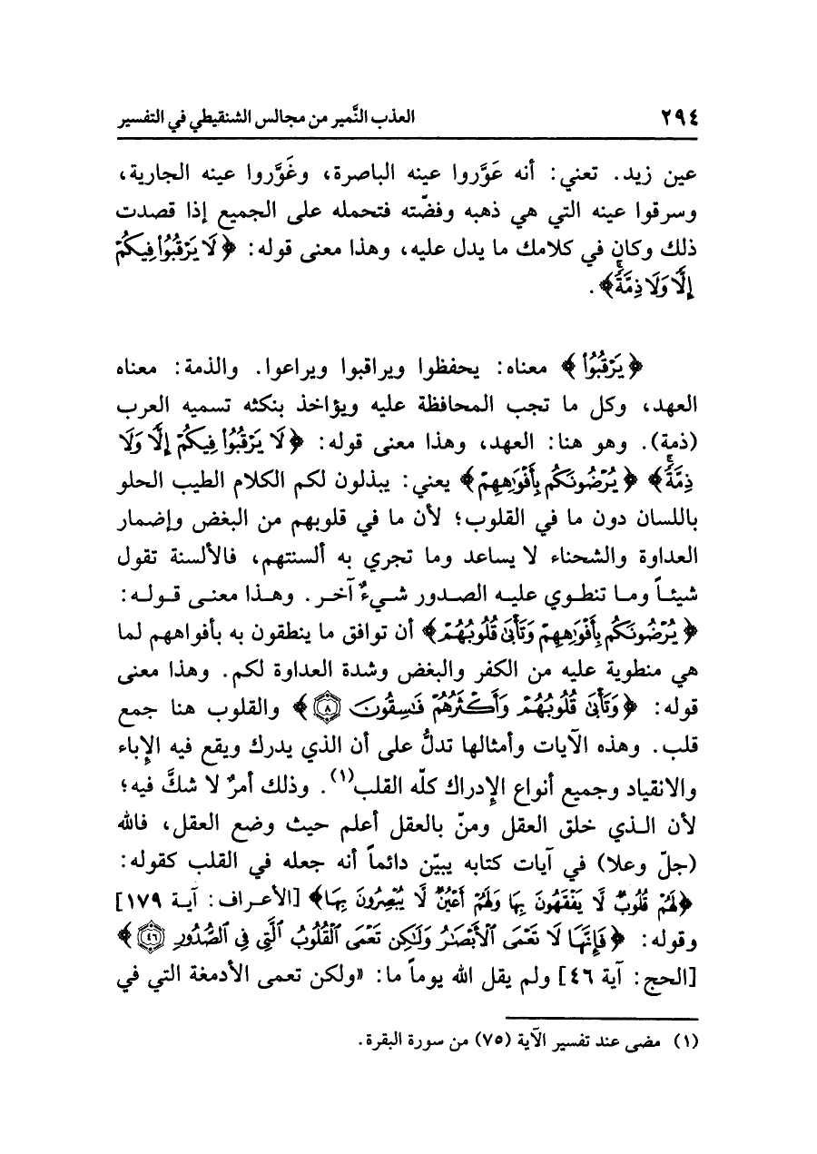 {يَرْقُبُواْ} معناه: يَحْفَظُوا ويُرَاقِبُوا ويُرَاعُوا. والذمَّةُ: مَعْنَاهُ العَهْدُ، وكل ما تجب المحافظة عليه ويؤاخذ بِنَكْثِهِ تسميه العرب (ذِمَّة). وهو هنا: العَهْدُ، وهذا معنى قوله: {لَا يَرْقُبُواْ فِيكُمْ إِلاًّ وَلَا ذِمَّةً} {يُرْضُونَكُم بِأَفْوَاهِهِمْ} يعني: يبذلون لكم الكلام الطيب الحلو باللسان دون ما في القلوب؛ لأن ما في قلوبهم من البغض وإضمار العداوة والشحناء لا يساعد وما تجري به ألسنتهم، فالألسنة تقول شيئاً وما تنطوي عليه الصدور شيءٌ آخر. وهذا معنى قوله: {يُرْضُونَكُم بِأَفْوَاهِهِمْ وَتَأْبَى قُلُوبُهُمْ} أي: تُوَافِقُ مَا يَنْطِقُونَ بِهِ بِأَفْوَاهِهِمْ لما هي منطوية عليه من الكفر والبغض وشدة العَدَاوَةِ لَكُمْ. وهذا معنى قوله: {وَتَأْبَى قُلُوبُهُمْ وَأَكْثَرُهُمْ فَاسِقُونَ} والقلوب هنا جمع قَلْب. وهذه الآيات وأمثالها تدلُّ على أن الذي يدرك ويقع فيه الإباء والانْقِيَاد وجميع أنواع الإدْرَاك كلّه القلب (¬١). وذلك أمرٌ لا شك فيه؛ لأن الذي خلق العقل ومنَّ بالعَقْلِ أعْلَم حيث وَضَعَ العَقْل، فالله (جلّ وعلا) في آيات كتابه يبين دائماً أنه جعله في القلب كقوله: {لهُمْ قُلُوبٌ لَاّ يَفْقَهُونَ بِهَا وَلَهُمْ أَعْيُنٌ لَاّ يُبْصِرُونَ بِهَا} [الأعراف: آية ١٧٩] وقوله: {فَإِنَّهَا لَا تَعْمَى الأَبْصَارُ وَلَكِن تَعْمَى الْقُلُوبُ الَّتِي فِي الصُّدُورِ} [الحج: آية ٤٦] ولم يقل الله يوماً ما: ولكن تعمى الأدمغة التي في