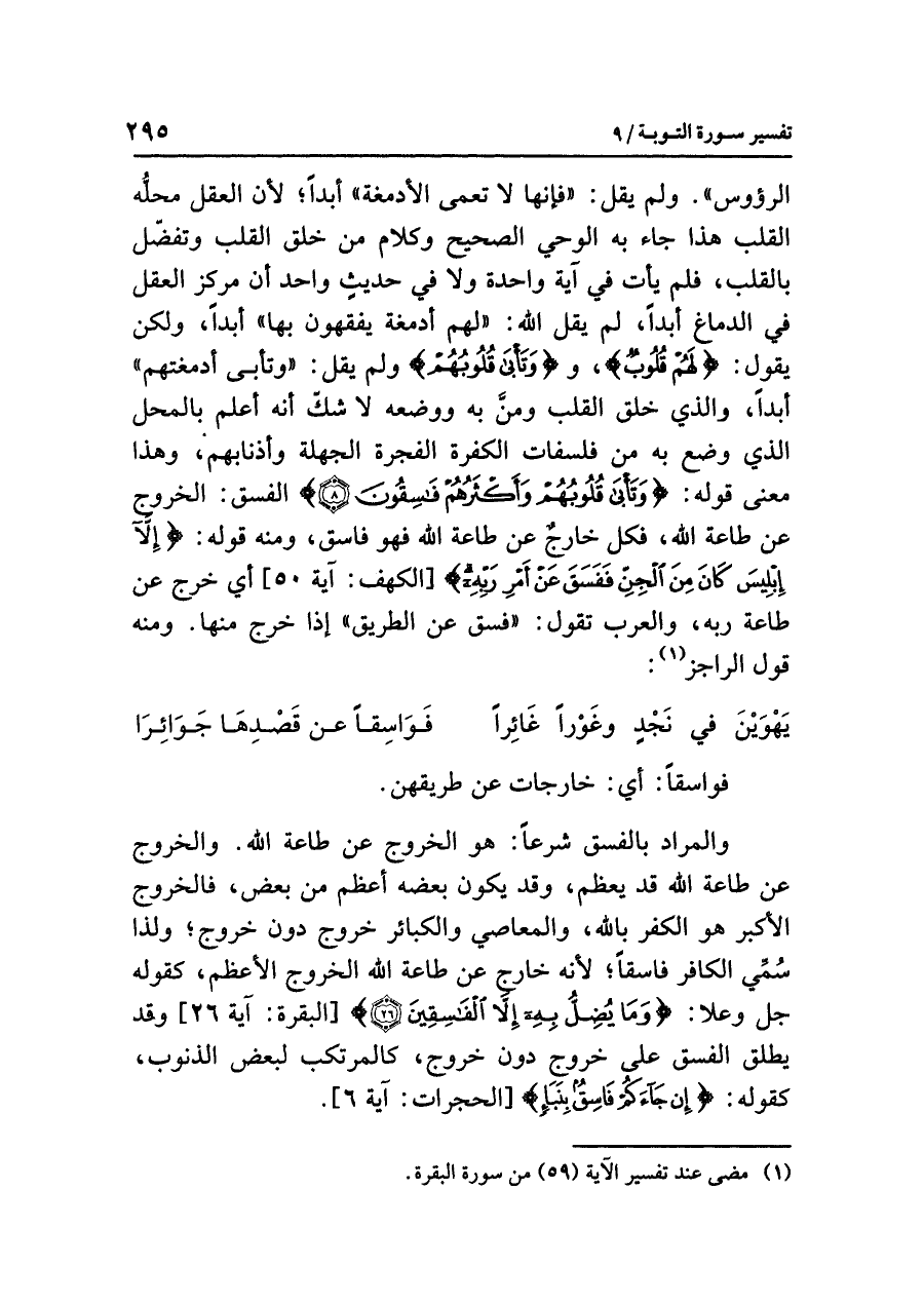 أبداً، والذي خَلَقَ القَلْبَ وَمَنَّ به ووضعه لا شكّ أنه أعلم بالمحل الَّذِي وَضَعَ به مِنْ فَلْسَفَاتِ الكَفَرَةِ الفَجَرَةِ الجَهَلَةِ وأذْنَابِهِمْ، وهذا معنى قوله: {وَتَأْبَى قُلُوبُهُمْ وَأَكْثَرُهُمْ فَاسِقُونَ} الفسق: الخروج عن طاعة الله، فكل خارجٌ عن طاعة الله فَهُو فَاسِق، ومنه قوله: {إِلَاّ إِبْلِيسَ كَانَ مِنَ الْجِنِّ فَفَسَقَ عَنْ أَمْرِ رَبِّهِ} [الكهف: آية ٥٠] أيْ خَرَجَ عَنْ طَاعَةِ رَبِّهِ، والعَرَبُ تقول: فسق عن الطريق: إذا خرج منها. ومنه قول الرَّاجِزِ (¬١):