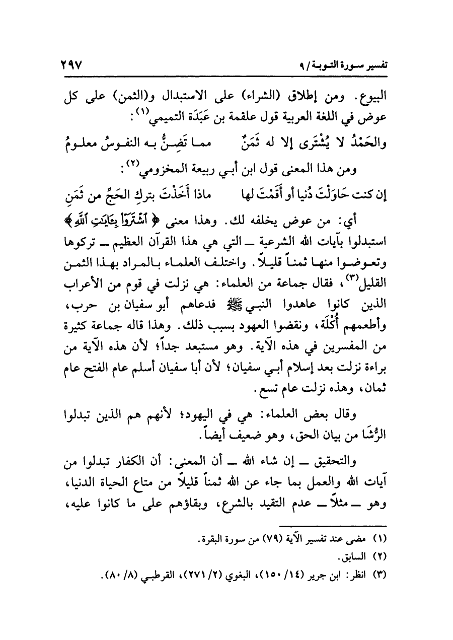 أي: من عوض يخلفه لك. وهذا معنى {اشْتَرَوْاْ بِآيَاتِ اللَّهِ} استبدلوا بآيات الله الشرعية -التي هي هذا القرآن العظيم- تركوها وتَعَوَّضُوا منها ثمناً قليلاً. واختلف العلماء بالمراد بهذا الثَّمَنِ القَلِيل (¬٣)، فقال جماعة من العلماء: هي نزلت في قوم من الأعراب الذين كانوا عاهدوا النبي صلى الله عليه وسلم فدعاهم أبو سفيان بن حرب، وأطعمهم أُكْلَة، ونقضوا العهود بسبب ذلك. وهذا قاله جَمَاعَةٌ كَثِيرَةٌ مِنَ المفسرين في هذه الآية. وهو مستبعد جدّاً؛ لأن هذه الآية من براءة نزلت بعد إسلام أبي سفيان؛ لأنَّ أَبَا سُفْيَانَ أَسْلَمَ عَامَ الفَتْحِ عَامَ ثَمَانٍ، وَهَذِهِ نَزَلَتْ عَامَ تِسْعٍ.