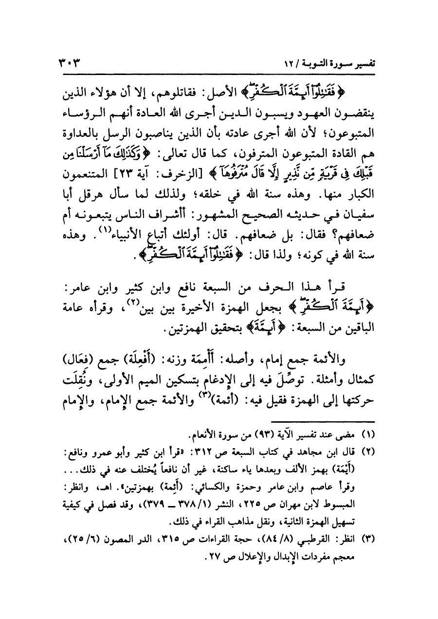 قرأ هذا الحرف من السبعة نافع وابن كثير وابن عامر: {أَئِمَّةَ الْكُفْرِ} بجعل الهمزة الأخيرة بين بين (¬٢)، وقرأه عامة الباقين من السبعة: {أَئِمَّةَ} بتحقيق الهمزتين.