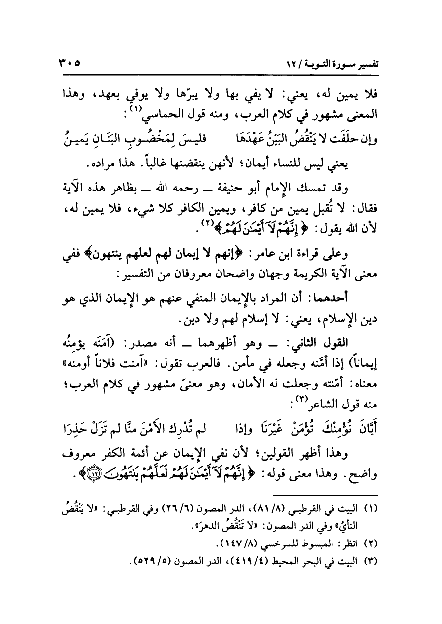 وقد تمسك الإمام أبو حنيفة -رحمه الله- بظاهر هذه الآية فقال: لا تُقبل يمين من كافر، ويمين الكافر كَلَا شَيْء، فلا يمين له؛ لأن الله يقول: {إِنَّهُمْ لَا أَيْمَانَ لَهُمْ} (¬٢).