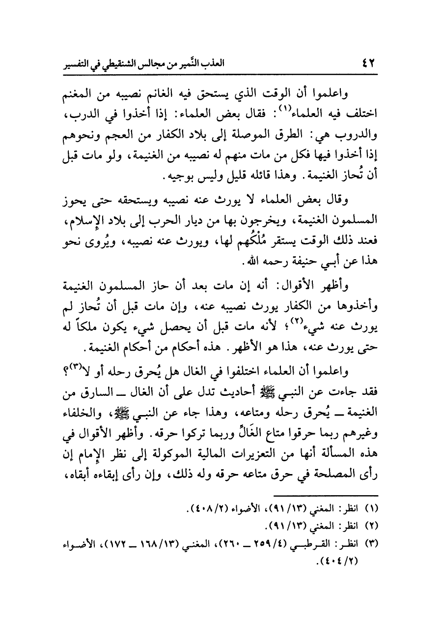 واعلموا أن الوقت الذي يستحق فيه الغانم نصيبه من المغنم اختلف فيه العلماء (¬١): فقال بعض العلماء: إذا أخذوا في الدرب، والدروب هي: الطرق الموصلة إلى بلاد الكفار من العَجَمِ ونحْوِهِمْ إذا أخذوا فيها فَكُلّ مَنْ مَاتَ مِنْهُمْ لَهُ نَصِيبُهُ من الغنيمة، ولو مات قبل أن تُحاز الغنيمة. وهذا قائله قليل وليس بوجيه.