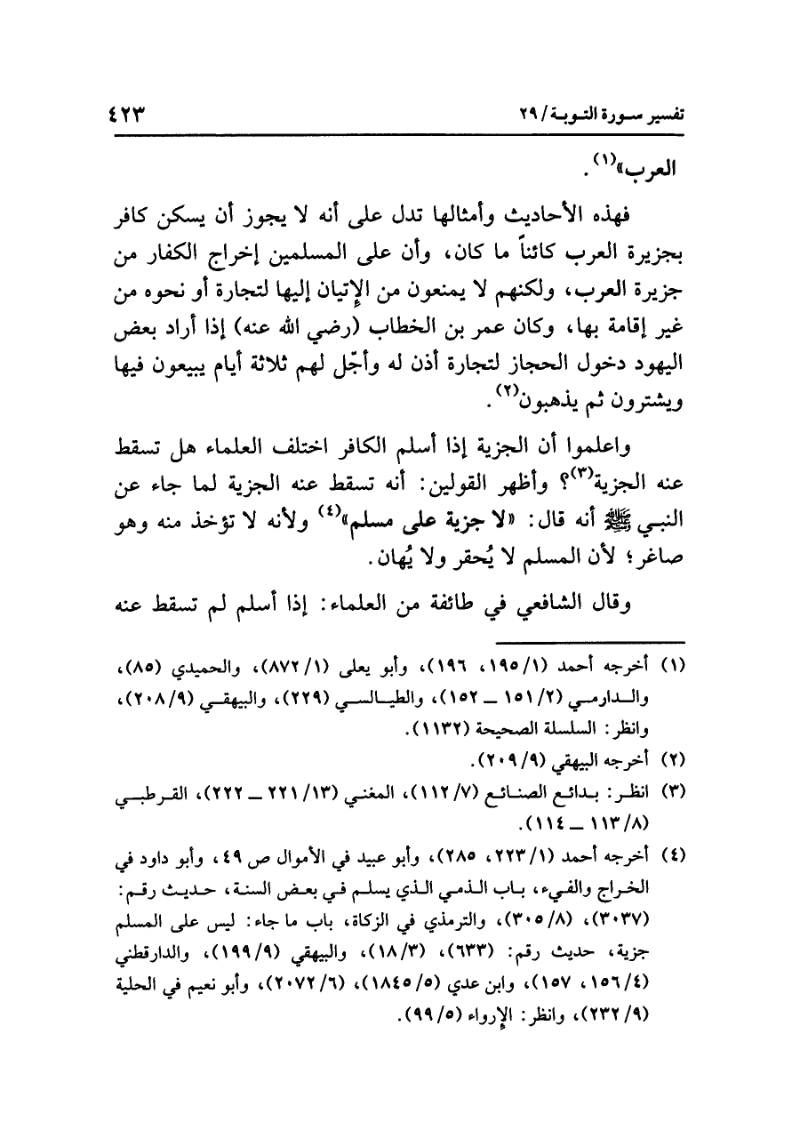 وَاعْلَمُوا أن الجزيةَ إذا أَسْلَمَ الكافرُ اختلف العلماءُ هل تسقطُ عنه الجزيةُ (¬٣)؟ وَأَظْهَرُ القولينِ: أنه تسقطُ عنه الجزيةُ لِمَا جاءَ عن النبيِّ صلى الله عليه وسلم أنه قال: «لَا جِزْيَةَ عَلَى مُسْلِمٍ» (¬٤) ولأنه لا تُؤْخَذُ منه وهو صَاغِرٌ؛ لأن المسلمَ لا يُحَقَّرُ ولَا يُهَانُ.