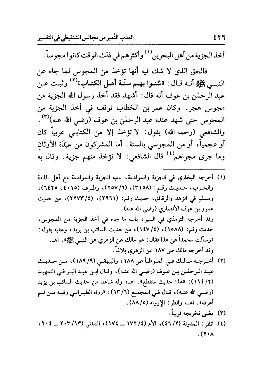 فالحقُّ الذي لا شكَّ فيه أنها تُؤْخَذُ من المجوسِ لِمَا جاء عن النبيِّ صلى الله عليه وسلم أنه قال: «سُنُّوا بِهِمْ سُنَّةَ أَهْلِ الْكِتَابِ» (¬٢) وَثَبَتَ عن عبدِ الرحمنِ بنِ عوفٍ أنه قال: أَشْهَدُ فقد أَخَذَ رسولُ اللَّهِ الجزيةَ من مجوسِ هجرَ. وكان عمرُ بنُ الخطابِ تَوَقَّفَ في أَخْذِ الجزيةِ من المجوسِ حتى شَهِدَ عندَه عبدُ الرحمنِ بنُ عوفٍ (رضي الله عنه) (¬٣).