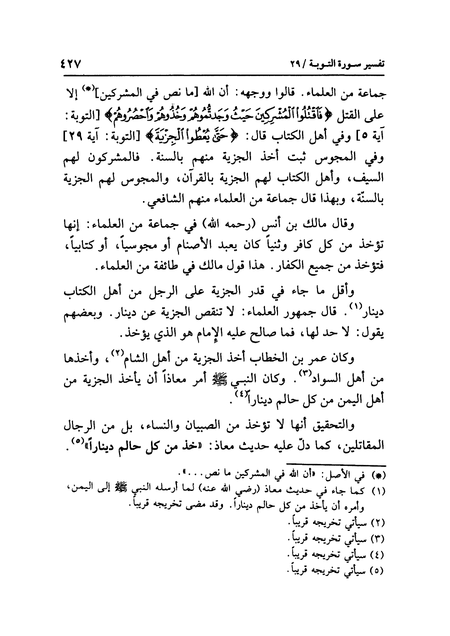 جماعةٌ من العلماءِ. قالوا ووجهُه: أن اللَّهَ [مَا نَصَّ في المشركينَ] (¬١) إلا على القتلِ: {فَاقْتُلُوا الْمُشْرِكِينَ حَيْثُ وَجَدتُّمُوهُمْ وَخُذُوهُمْ وَاحْصُرُوهُمْ} [التوبة: آية ٥] وفي أهلِ الكتابِ قال: {حَتَّى يُعْطُوا الْجِزْيَةَ} [التوبة: آية ٢٩] وفي المجوسِ ثَبَتَ أخذُ الجزيةِ منهم بالسنةِ. فالمشركونَ لهم السيفُ، وأهلُ الكتابِ لهم الجزيةُ بالقرآنِ، والمجوسُ لهم الجزيةُ بِالسُّنَّةِ، وبهذا قال جماعةٌ من العلماءِ منهم الشافعيُّ.