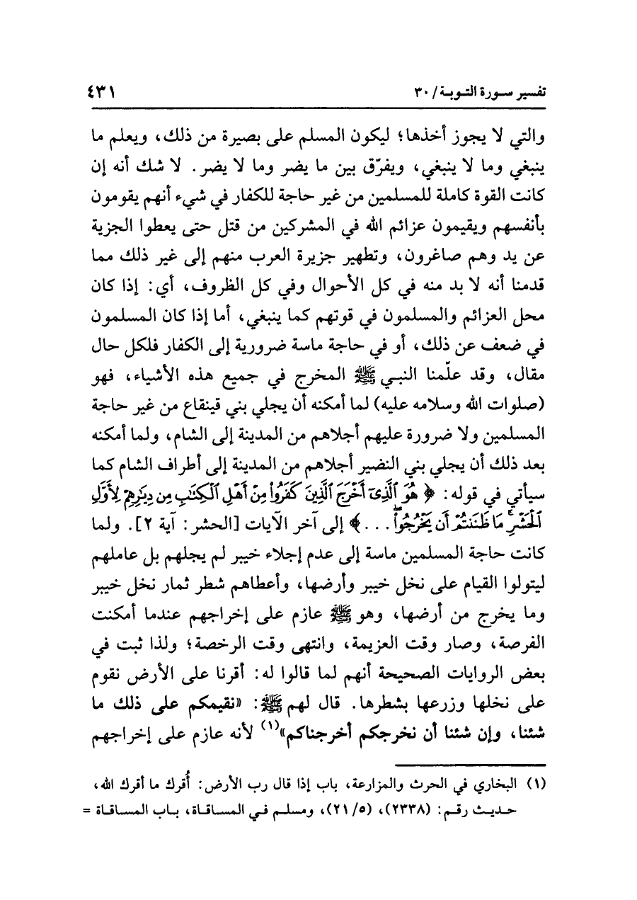 (¬١) البخاري في الحرث والمزارعة، باب: إذا قال رب الأرض: أُقرك ما أقرك الله .. حديث رقم: (٢٣٣٨) (٥/ ٢١)، ومسلم في المساقاة، باب: المساقاة والمعاملة بجزء من الثمر والزرع. حديث رقم: (١٥٥١) (٣/ ١١٨٧).