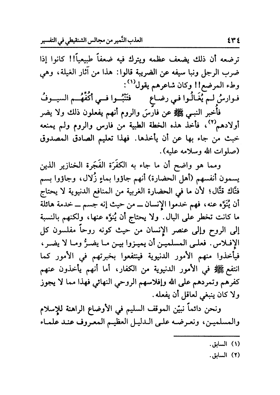 وَمِمَّا هو واضحٌ أن ما جاء به الكفَرَةُ الفَجَرَةُ الخنازيرُ الذين يُسَمُّونَ أنفسَهم (أهلَ الحضارةِ) أنهم جاؤوا بماءٍ زُلَالٍ، وجاؤوا بِسُمٍّ فَتَّاكٍ قَتَّالٍ؛ لأن ما في الحضارةِ الغربيةِ من المنافعِ الدنيويةِ لا يحتاجُ أن يُنَوَّهَ عنه، فَهُمْ خَدَمُوا الإنسانَ - من حيث إنه جِسْمٌ - خدمةً هائلةً ما كانت تخطرُ على البالِ. ولَا يُحْتَاجُ أن يُنوَّهَ عنها، ولكنهم بالنسبةِ إلى الروحِ وإلى عنصرِ الإنسانِ من حيثُ كونه رُوحًا مُفْلِسُونَ كُلَّ الإفلاسِ. فعلى المسلمينَ أن يُمَيِّزُوا بَيْنَ ما يَضُرُّ وما لا يَضُرُّ، فيأخذوا منهم الأمورَ الدنيويةَ فينتفعوا بخبرتِهم في الأمورِ كما انتفعَ صلى الله عليه وسلم فِي الأمورِ الدنيويةِ من الكفارِ، أما أنهم يأخذونَ عنهم كُفْرَهُمْ وَتَمَرُّدَهُمْ على اللَّهِ وإفلاسَهم الروحيَّ النهائيَّ فهذا مِمَّا لا يجوزُ وَلَا كان ينبغِي لعاقلٍ أن يفعلَه.