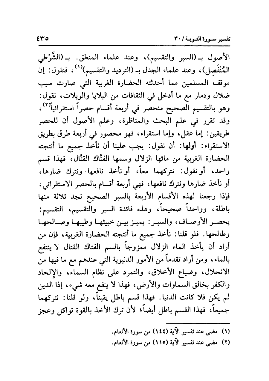 أَوَّلُهَا: أن نقولَ: يجبُ علينا أن نأخذَ جميعَ ما أَنْتَجَتْهُ الحضارةُ الغربيةُ من مائِها الزلالِ وَسُمِّهَا الفتَّاكِ القتَّالِ، فهذا قِسْمٌ وَاحِدٌ، أو نقولُ: نتركهما معًا، أو نأخذُ نافعَها ونتركُ ضارَّها، أو نأخذُ ضَارَّهَا ونتركُ نافعَها، فهي أربعةُ أقسامٍ بالحصرِ الاستقرائيِّ، فإذا رَجَعْنَا لهذه الأقسامِ الأربعةِ بِالسَّبْرِ الصحيحِ نَجِدُ ثلاثةً منها باطلةً، وواحدًا صحيحًا، وهذه فائدةُ السبرِ والتقسيمِ، التقسيمُ: يحصرُ الأوصافَ، والسبرُ: يُمَيِّزُ بَيْنَ خَبِيثِهَا وَطَيِّبِهَا وصالحِها وطالحِها. فلو قُلْنَا: نَأْخُذُ جميعَ ما أَنْتَجَتْهُ الحضارةُ الغربيةُ، فإن مَنْ أرادَ أن يأخذَ الماءَ الزلالَ مَمْزُوجًا بالسمِّ الفتاكِ القَتَّالِ لَا ينتفعُ بالماءِ، وَمَنْ أَرَادَ تَقَدُّمًا مِنَ الأمورِ الدنيويةِ التي عندهم مع ما فيها من الانحلالِ، وضياعِ الأخلاقِ، والتمردِ على نظامِ السماءِ، والإلحادِ والكفرِ بخالقِ السماواتِ والأرضِ، فهذا لا ينفعُ معه شيءٌ، إذا الدينُ لم يَكُنْ فَلَا كانت الدنيا. فهذا قِسْمٌ باطلٌ يَقِينًا، ولو قلنا: نتركهما جميعًا، فهذا القسمُ باطلٌ أيضًا؛ لأَنَّ تركَ الأخذِ بالقوةِ تَوَاكُلٌ وعجزٌ