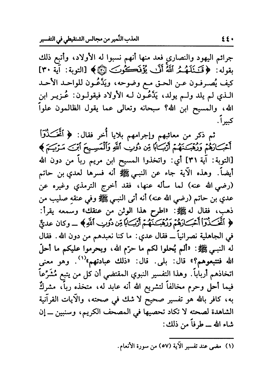ثم ذَكَرَ من معائبِهم وإجرامِهم بلايا أُخَرَ فقال: {اتَّخَذُوا أَحْبَارَهُمْ وَرُهْبَانَهُمْ أَرْبَابًا مِّنْ دُونِ اللَّهِ وَالْمَسِيحَ ابْنَ مَرْيَمَ} [التوبة: آية ٣١] أي: وَاتَّخَذُوا المسيحَ بنَ مريمَ رَبًّا من دونِ اللَّهِ أيضًا. وهذه الآيةُ جاء عن النبيِّ صلى الله عليه وسلم أنه فَسَّرَهَا لِعَدِيِّ بنِ حاتمٍ (رضي الله عنه) لَمَّا سَأَلَهُ عنها، فقد أَخْرَجَ الترمذيُّ وغيرُه عن عديِّ بنِ حاتمٍ (رضي الله عنه) أنه أتى النبيَّ صلى الله عليه وسلم وفي عُنُقِهِ صليبٌ من ذَهَبٍ، فقال له صلى الله عليه وسلم: «اطْرَحْ هَذَا الْوَثَنَ مِنْ عُنُقِكَ» وَسَمِعَهُ يقرأُ: {اتَّخَذُوا أَحْبَارَهُمْ وَرُهْبَانَهُمْ أَرْبَابًا مِّنْ دُونِ اللَّهِ} - وكان عَدِيٌّ في الجاهليةِ نَصْرَانيًّا - فقال عَدِيٌّ: ما كُنَّا نعبدُهم من دونِ اللَّهِ. فقال له النبيُّ صلى الله عليه وسلم: «أَلَمْ يُحِلُّوا لَكُمْ مَا حَرَّمَ اللَّهُ، وَيُحَرِّمُوا عَلَيْكُمْ مَا أَحَلَّ اللَّهُ فَتَتَّبِعُوهُمْ؟» قال: بَلَى. قال: «ذَلِكَ عِبَادَتُهُمْ» (¬١). وهو معنَى اتخاذِهم أربابًا. وهذا التفسيرُ النبويُّ المقتضِي أن كُلَّ مَنْ يَتَّبِعُ مُشَرِّعًا فيما أَحَلَّ وَحَرَّمَ مُخَالِفًا لتشريعِ اللَّهِ أنه عابدٌ له، متخذُه رَبًّا، مُشْرِكٌ به، كافرٌ بالله هو تفسيرٌ صحيحٌ لا شَكَّ في صحتِه، والآياتُ القرآنيةُ الشاهدةُ لصحتِه لَا تكادُ تُحْصِيهَا في المصحفِ الكريمِ، وَسَنُبَيِّنُ - إن شاء الله - طَرَفًا من ذلك: