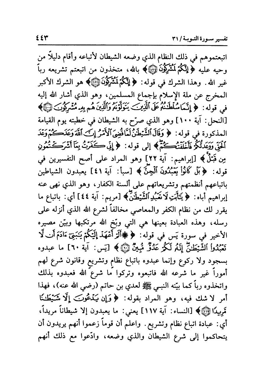اتَّبَعْتُمُوهُمْ في ذلك النظامِ الذي وَضَعَهُ الشيطانُ لأَتْبَاعِهِ وَأَقَامَ دليلاً من وَحْيِهِ عليه {إِنَّكُمْ لَمُشْرِكُونَ} بِاللَّهِ، متخذونَ مَنِ اتَّبَعْتُمْ تشريعَه رَبًّا غيرَ اللَّهِ. وهذا الشركُ في قولِه: {إِنَّكُمْ لَمُشْرِكُونَ} هو الشركُ الأكبرُ المخرجُ عن مِلَّةِ الإسلامِ بإجماعِ المسلمينَ، وهو الذي أَشَارَ اللَّهُ إليه في قولِه: {إِنَّمَا سُلْطَانُهُ عَلَى الَّذِينَ يَتَوَلَّوْنَهُ وَالَّذِينَ هُمْ بِهِ مُشْرِكُونَ (١٠٠)} [النحل: آية ١٠٠] وهو الذي صَرَّحَ به الشيطانُ في خطبتِه يومَ القيامةِ المذكورةِ في قولِه: {وَقَالَ الشَّيْطَانُ لَمَّا قُضِيَ الأَمْرُ إِنَّ اللَّهَ وَعَدَكُمْ وَعْدَ الْحَقِّ وَوَعَدتُّكُمْ فَأَخْلَفْتُكُمْ} إلى قولِه: {إِنِّي كَفَرْتُ بِمَا أَشْرَكْتُمُونِ مِنْ قَبْلُ} [إبراهيم: آية ٢٢] وهو المرادُ على أَصَحِّ التفسيرين في قولِه: {بَلْ كَانُوا يَعْبُدُونَ الْجِنَّ} [سبأ: آية ٤١] يعبدونَ الشياطينَ باتباعِهم أنظمتَهم وتشريعاتِهم على ألسنةِ الكفارِ، وهو الذي نَهَى عنه إبراهيمُ أَبَاهُ: {يَا أَبَتِ لَا تَعْبُدِ الشَّيْطَانَ} [مريم: آية ٤٤] أي: بِاتِّبَاعِ ما يقررُ لَكَ من نظامِ الكفرِ والمعاصِي مُخَالِفًا لشرعِ اللَّهِ الذي أَنْزَلَهُ على رُسُلِهِ، وهذه العبادةُ بعينِها هي التي وَبَّخَ اللَّهُ مُرْتَكِبَهَا وَبَيَّنَ مصيرَه الأخيرَ في سورةِ "يس" في قولِه: {أَلَمْ أَعْهَدْ إِلَيْكُمْ يَا بَنِي آدَمَ أَن لَاّ تَعْبُدُوا الشَّيْطَانَ إِنَّهُ لَكُمْ عَدُوٌّ مُّبِينٌ (٦٠)} [يس: آية ٦٠] ما عَبَدُوهُ بسجودٍ ولَا ركوعٍ وإنما عَبَدُوهُ باتباعِ نظامٍ وتشريعٍ وقانونٍ شَرَعَ لهم أمورًا غيرَ ما شَرَعَهُ اللَّهُ فاتبعوه وتركوا ما شَرَعَ اللَّهُ فعبدوه بذلك واتخذوه رَبًّا كما بَيَّنَهُ النبيُّ صلى الله عليه وسلم لعديِّ بنِ حاتمٍ (رضي الله عنه)، فهذا أمرٌ لَا شَكَّ فيه، وهو المرادُ بقولِه: {وَإِنْ يَدْعُونَ إِلَاّ شَيْطَانًا مَّرِيدًا} [النساء: آية ١١٧] يعني: ما يعبدونَ إلا شيطانًا مَرِيدًا،