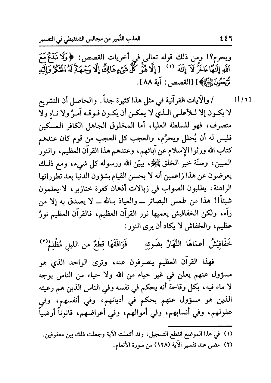 [٦/أ] / والآياتُ القرآنيةُ في مثلِ هذا كثيرةٌ جِدًّا. والحاصلُ أن التشريعَ لا يكونُ إلا للأعلى الذي لا يمكنُ أن يكونَ فوقَه آمِرٌ ولَا نَاهٍ ولا مُتَصَرِّفٌ، فهو للسلطةِ العليا، أما المخلوقُ الجاهلُ الكافرُ المسكينُ فليس له أن يُحللَ ويحرِّمَ، والعجبُ كُلُّ العجبِ مِنْ قومٍ كان عندهم كتابُ اللَّهِ وَرِثُوا الإسلامَ عن آبائِهم، وعندَهم هذا القرآنُ العظيمُ، والنورُ المبينُ، وَسُنَّةُ خيرِ الخلقِ صلى الله عليه وسلم، يُبَيِّنُ اللَّهُ ورسولُه كُلَّ شيءٍ، ومع ذلك يعرضونَ عن هذا زاعمينَ أنه لا يَحْسُنُ القيامُ بشؤونِ الدنيا بعدَ تطوراتِها الراهنةِ، يطلبونَ الصوابَ في زبالاتِ أذهانِ كفرةٍ خنازيرَ، لَا يعلمونَ شيئًا!! هذا مِنْ طمسِ البصائرِ - والعياذُ بالله - لا يُصَدِّقُ به إلا مَنْ رآه، ولكن الخفافيشَ يعميها نورُ القرآنِ العظيمِ، فالقرآنُ العظيمُ نورٌ عظيمٌ، والخفاشُ لا يكادُ أن يرى النورَ:
