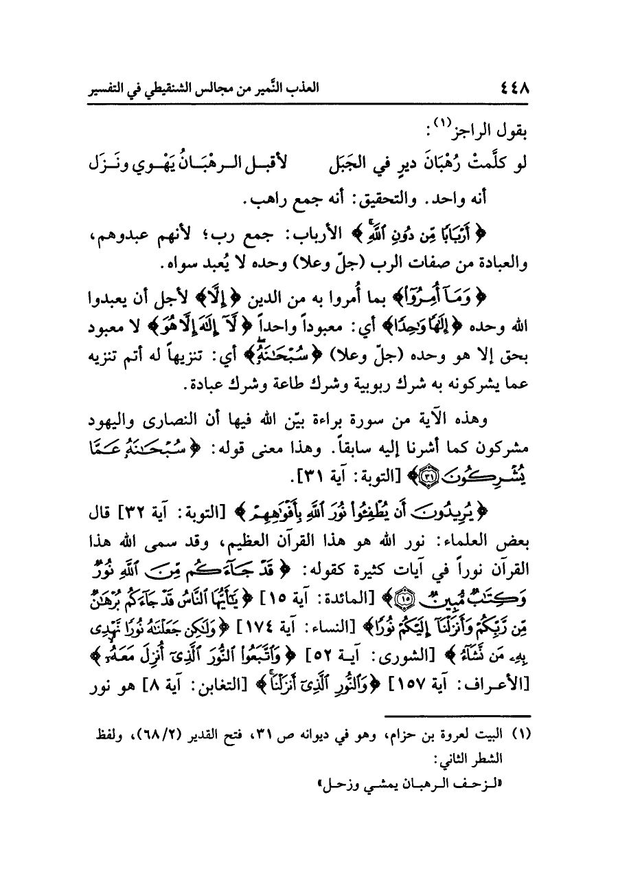 {يُرِيدُونَ أَنْ يُطْفِؤُوا نُورَ اللَّهِ بِأَفْوَاهِهِمْ} [التوبة: آية ٣٢] قال بعضُ العلماءِ: نورُ اللَّهِ هو هذا القرآنُ العظيمُ، وقد سَمَّى اللَّهُ هذا القرآنَ نُورًا في آياتٍ كثيرةٍ كقولِه: {قَدْ جَاءَكُم مِّنَ اللَّهِ نُورٌ وَكِتَابٌ مُّبِينٌ} [المائدة: آية ١٥] {يَا أَيُّهَا النَّاسُ قَدْ جَاءَكُمْ بُرْهَانٌ مِّن رَّبِّكُمْ وَأَنْزَلْنَا إِلَيْكُمْ نُورًا} [النساء: آية ١٧٤] {وَلَكِنْ جَعَلْنَاهُ نُورًا نَّهْدِي بِهِ مَنْ نَّشَاءُ} [الشورى: آية ٥٢] {وَاتَّبَعُوا النُّورَ الَّذِيَ أُنْزِلَ مَعَهُ} [الأعراف: آية ١٥٧] {وَالنُّورِ الَّذِي أَنْزَلْنَا} [التغابن: آية ٨] هو نورٌ