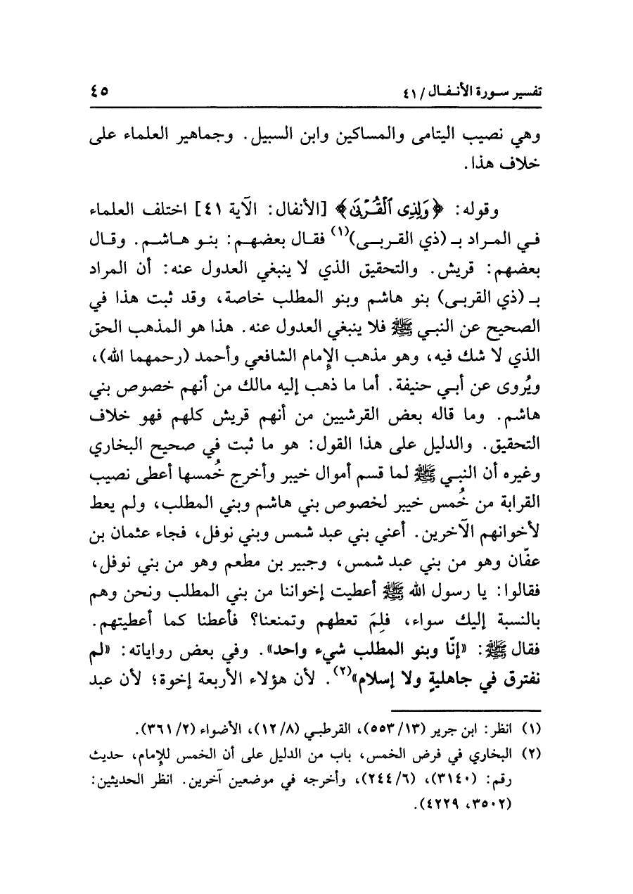 وقوله: {وَلِذِي الْقُرْبَى} [الأنفال: الآية ٤١] اختلف العلماء في المراد بـ (ذي القربى) (¬١) فقال بعضهم: بنو هاشم. وقال بعضهم: قريش. والتحقيق الذي لا ينبغي العدول عنه: أن المراد بـ (ذي القربى) بنو هاشم وبنو المطلب خاصة، وقد ثبت هذا في الصحيح عن النبي صلى الله عليه وسلم فلا ينبغي العدول عنه. هذا هو المذهب الحق الذي لا شك فيه، وهو مذهب الإمام الشافعي وأحمد (رحمهما الله)، وُيروى عن أبي حنيفة. أما ما ذهب إليه مالك من أنهم خصوص بني هاشم. وما قاله بعض القرشيين من أنهم قريش كلهم فهو خلاف التحقيق. والدليل على هذا القول: هو ما ثبت في صحيح البخاري وغيره أن النبي صلى الله عليه وسلم لما قسم أموال خيبر وأخرج خُمُسَهَا أعْطَى نَصِيبَ القَرَابَةِ مِنْ خُمس خيبر لخصوص بني هاشم وبني المطلب، ولم يُعْطِ لإخوانهم الآخرين -أعني بني عبد شمس وبني نوفل- فجاء عُثْمَان بن عَفَّان وهو مِنْ بَنِي عبد شمس، وجبير بن مطعم وهو مِنْ بَنِي نوفل، فقالوا: يا رَسُول الله صلى الله عليه وسلم أعطيت إخواننا مِنْ بَنِي المُطَّلِبِ ونحن وهم بالنسبة إليك سواء، فلِمَ تُعْطِهِمْ وتَمْنَعنا؟ فأعْطِنَا كما أعطيتهم. فقال صلى الله عليه وسلم: «إنّا وَبَنو المُطَّلِب شَيْءٌ وَاحِدٌ»، وفي بعض رواياته: «لَمْ نَفْتَرِقْ فِي جَاهِلِيَّةٍ وَلَا إِسْلَامٍ» (¬٢)؛ لأن هؤلاء الأربعة إخوة؛ لأن عبد مناف