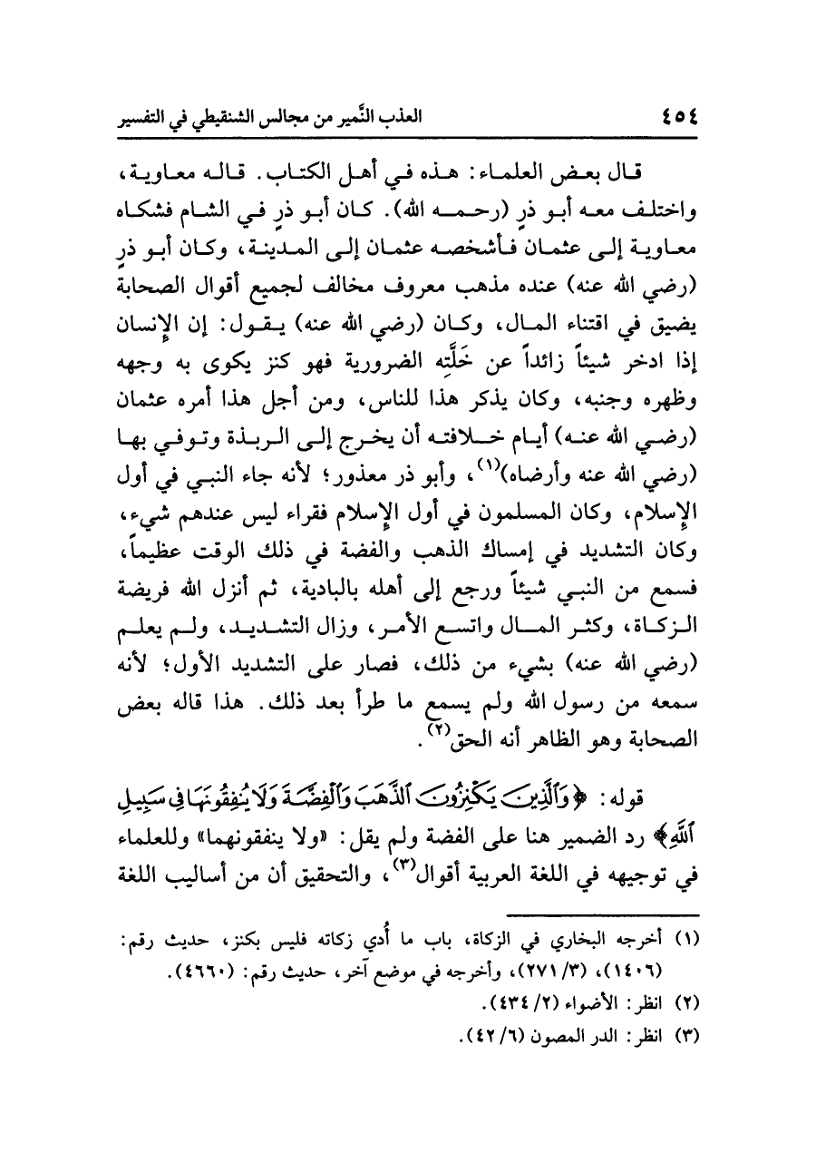 قولُه: {وَالَّذِينَ يَكْنِزُونَ الذَّهَبَ وَالْفِضَّةَ وَلَا يُنْفِقُونَهَا فِي سَبِيلِ اللَّهِ} رَدَّ الضميرَ هنا على الفضةِ ولم يَقُلْ: «ولَا ينفقونَهما» وللعلماءِ في توجيهِه في اللغةِ العربيةِ أقوالٌ (¬٣)، والتحقيقُ أن من أساليبِ اللغةِ