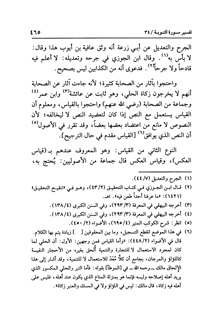 وَاحْتَجُّوا بآثارٍ من الصحابةِ كثيرةٍ؛ لأنه جاءت آثارٌ عن الصحابةِ أنهم لا يُخْرِجُونَ زكاةَ الْحُلِيِّ، وهو ثابتٌ عن عائشةَ (¬٣) وابنِ عمرَ (¬٤) وجماعةٍ من الصحابةِ (رضي الله عنهم) وَاحْتَجُّوا بالقياسِ، ومعلومٌ أن القياسَ يُسْتَعْمَلُ مع النصِّ إذا كان لتعضيدِ النصِّ لا لِيُخَالِفَهُ؛ لأن النصوصَ لَا مانعَ من اعتضادِ بعضِها بعضًا، وقد تَقَرَّرَ في الأصولِ (¬٥) أن النصَّ الذي يُوَافِق (¬٦) [القياسَ مُقَدَّمٌ في حالِ الترجيحِ].