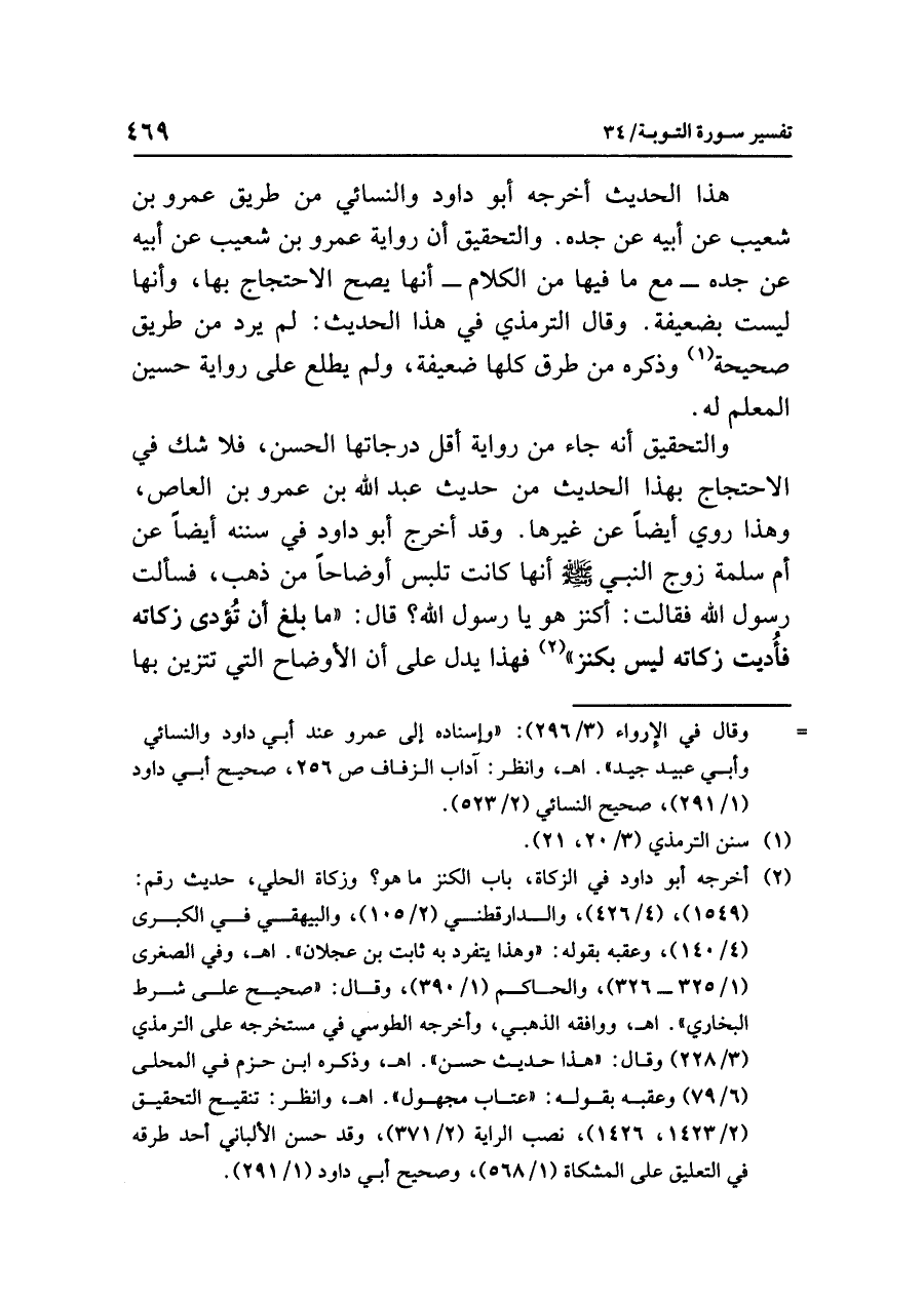 والتحقيقُ أنه جاء من روايةٍ أَقَلُّ درجاتِها الحسنُ، فلا شَكَّ في الاحتجاجِ بهذا الحديثِ من حديثِ عبدِ اللَّهِ بنِ عمرِو بنِ العاصِ، وهذا روي أيضًا عن غيرها. وقد أخرج أبو داودَ في سُنَنِهِ أيضًا عن أُمِّ سَلَمَةَ زوجِ النبيِّ صلى الله عليه وسلم أنها كانت تَلْبَسُ أوضاحًا من ذَهَبٍ، فسألت رسولَ اللَّهِ فقالت: أَكَنْزٌ هو يا رسولَ اللَّهِ؟ قال: «مَا بَلَغَ أَنْ تُؤَدَّى زَكَاتُهُ فَأُدِّيَتْ زَكَاتُهُ لَيْسَ بِكَنْزٍ» (¬٢) فهذا يدلُّ على أن الأوضاحَ التي تَتَزَيَّنُ بها