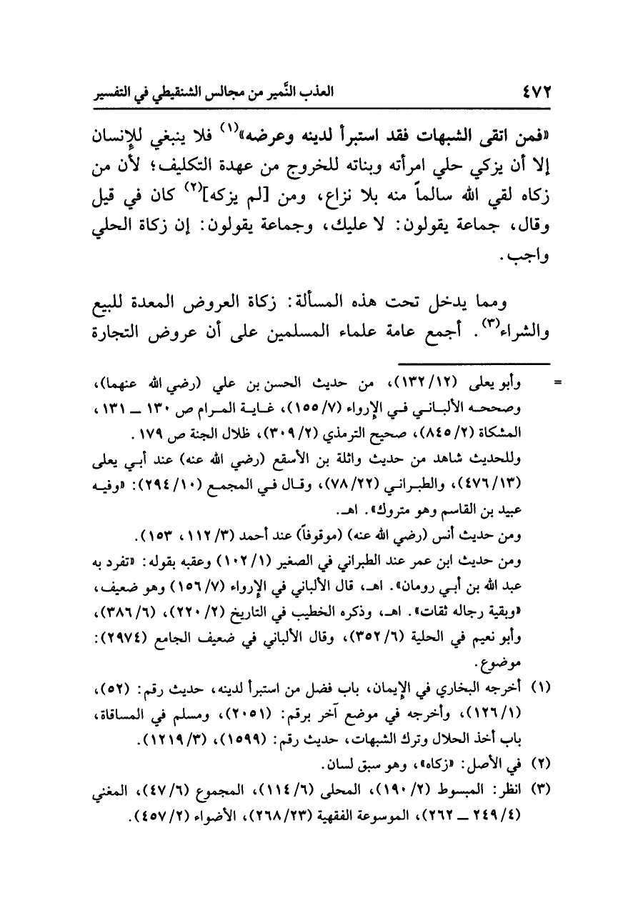 «فَمَنِ اتَّقَى الشُّبُهَاتِ فَقَدِ اسْتَبْرَأَ لِدِينِهِ وَعِرْضِهِ» (¬١) فلا ينبغِي للإنسانِ إلا أن يزكيَ حُلِيَّ امرأتِه وبناتِه للخروجِ من عهدةِ التكليفِ؛ لأن مَنْ زَكَّاهُ لَقِيَ اللَّهَ سَالِمًا منه بلا نزاعٍ، وَمَنْ [لم يُزَكِّهِ] (¬٢) كان في قيلٍ وقال، جماعةٌ يقولونَ: لَا عليكَ، وجماعة يقولونَ: إن زكاةَ الحليِّ واجبٌ.