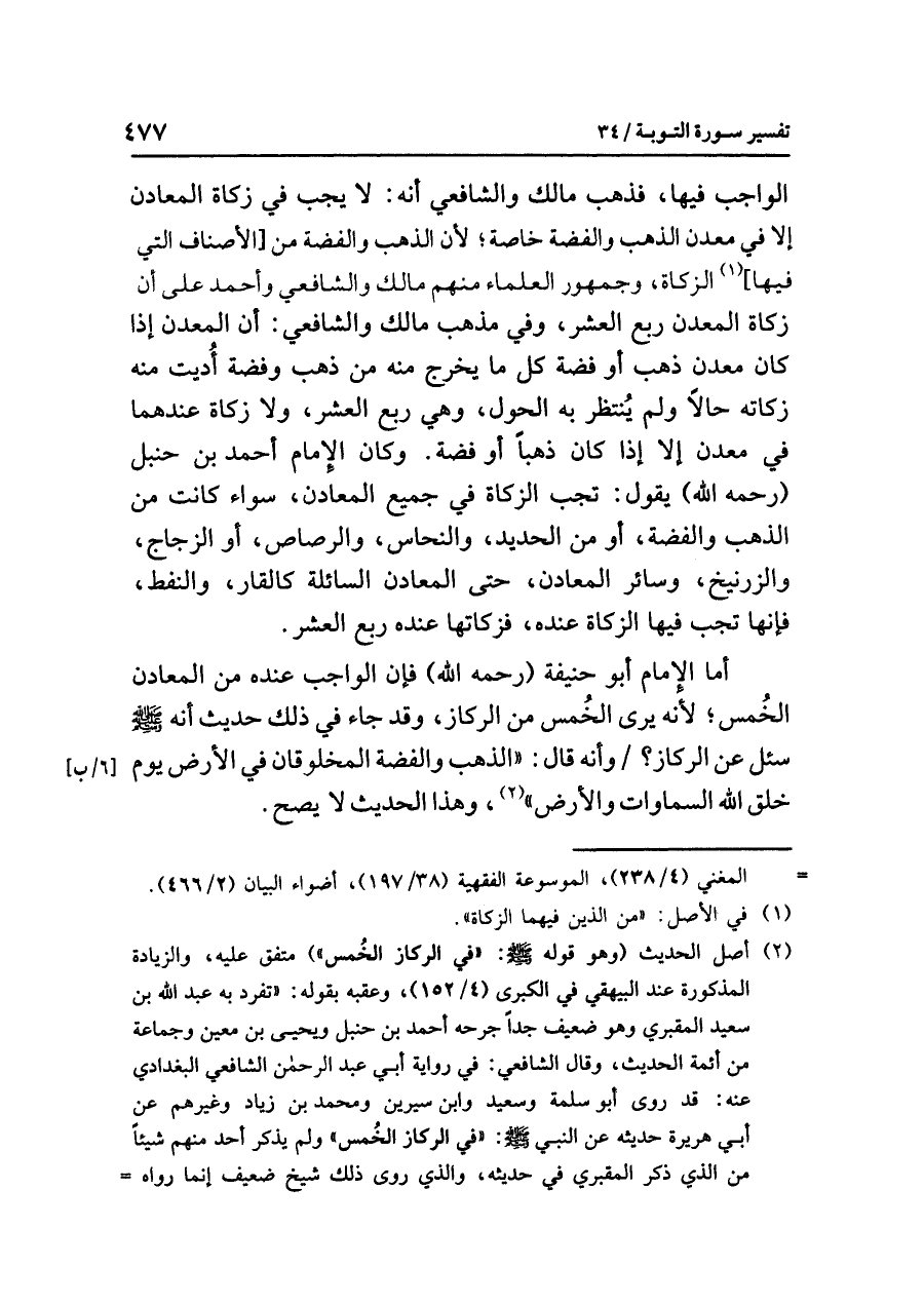 أما الإمامُ أبو حنيفةَ (رحمه الله) فإن الواجبَ عندَه من المعادنِ الْخُمْسُ؛ لأنه يرى الخُمسَ من الركازِ، وقد جاء في ذلك حديثٍ أنه صلى الله عليه وسلم سُئِلَ عن الركازِ؟ [٦/ب] / وأنه قال: «الذَّهَبُ وَالْفِضَّةُ الْمَخْلُوقَانِ فِي الأَرْضِ يَوْمَ خَلَقَ اللَّهُ السَّمَاوَاتِ وَالأَرْضَ» (¬٢)، وهذا الحديثُ لَا يَصِحُّ.