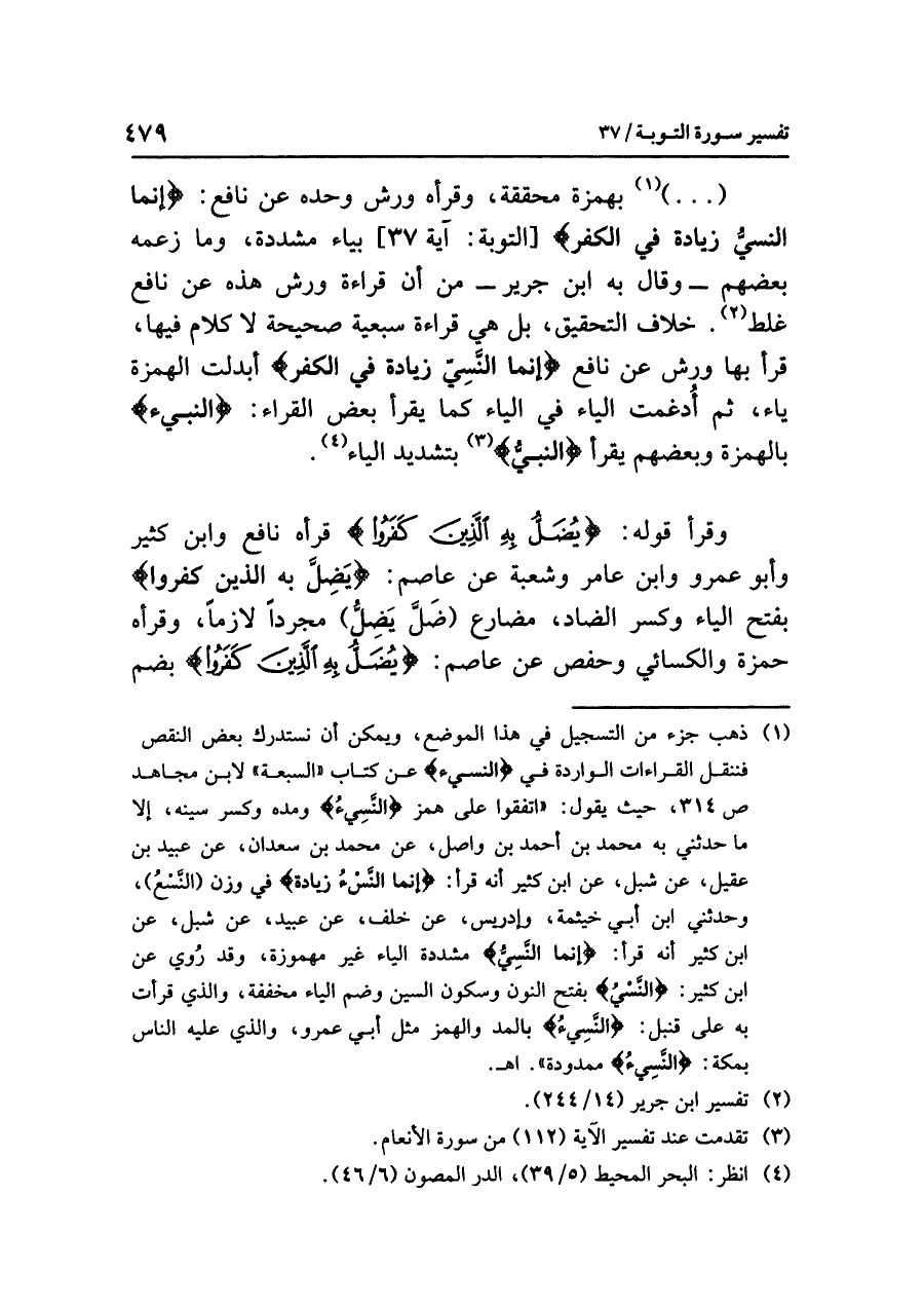 (¬١) ذهب جزء من التسجيل في هذا الموضع، ويمكن أن نستدرك بعض النقص فننقل القراءات الواردة في {النسيء} عن كتاب «السبعة» لابن مجاهد ص٣١٤، حيث يقول: "اتفقوا على همز {النَّسِيءُ} ومده وكسر سينه، إلا ما حدثني به محمد بن أحمد بن واصل، عن محمد بن سعدان، عن عبيد بن عقيل، عن شبل، عن ابن كثير أنه قرأ: {إنما النَّسْءُ زيادة} في وزن (النَّسْعُ). وحدثني ابن أبي خيثمة، وإدريس، عن خلف، عن عبيد، عن شبل، عن ابن كثير أنه قرأ: {إنما النَّسِيُّ} مشددة الياء غير مهموزة. وقد رُوي عن ابن كثير: {النَّسْيُ} بفتح النون وسكون السين وضم الياء مخففة. والذي قرأت به على قنبل: {النَّسِيءُ} بالمد والهمز مثل أبي عمرو. والذي عليه الناس بمكة، {النَّسِيءُ} ممدودة» اهـ.