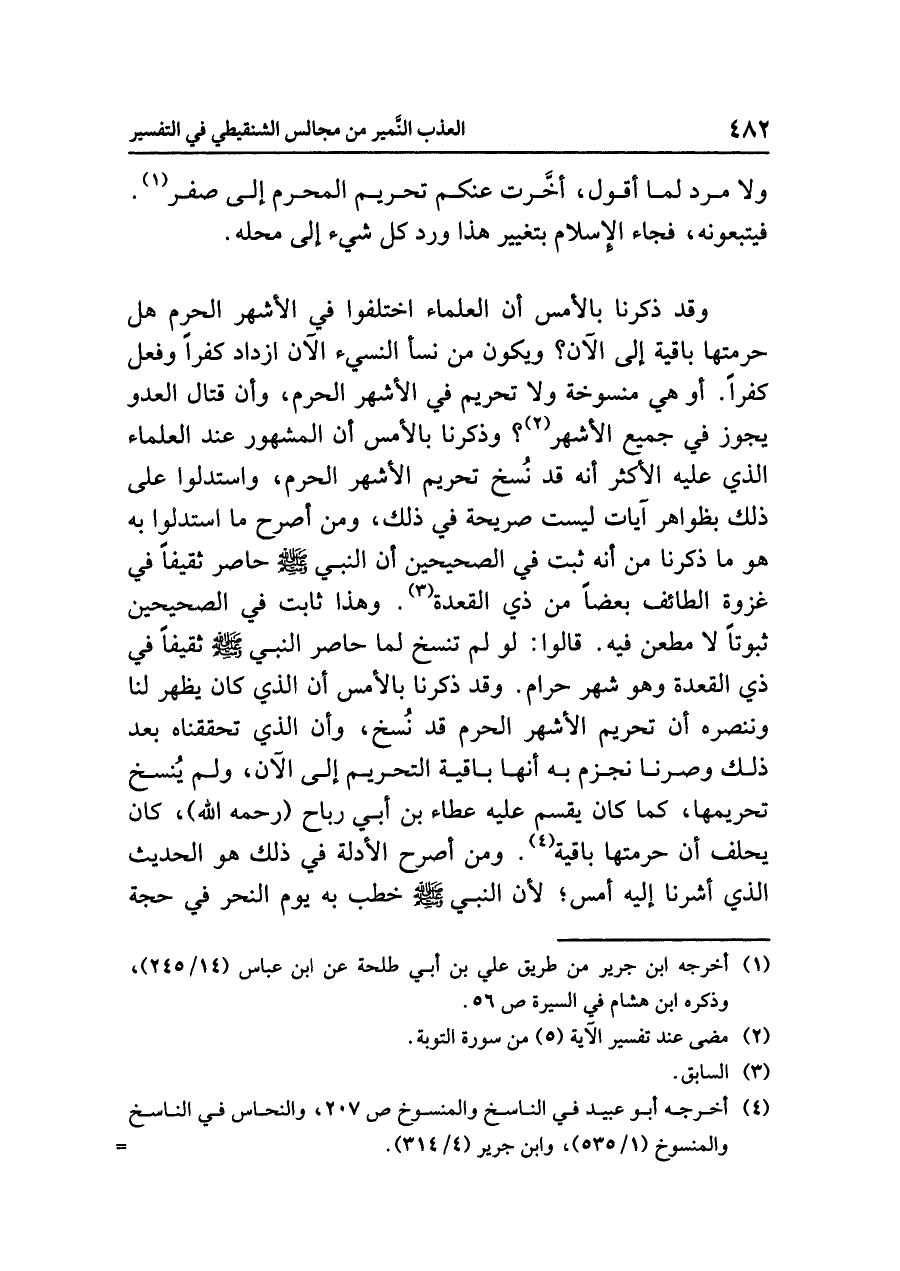 وقد ذَكَرْنَا أن العلماءَ اختلفوا في الأشهرِ الحرمِ هل حرمتُها باقيةٌ إلى الآن؟ ويكونُ مَنْ نَسَأَ النسيءَ الآنَ ازدادَ كفرًا وَفَعَلَ كفرًا. أو هي منسوخةٌ ولا تحريمَ في الأشهرِ الحرمِ، وأن قتالَ العدوِّ يجوزُ في جميعِ الأشهرِ (¬٢)؟ وَذَكَرْنَا أن المشهورَ عند العلماءِ الذي عليه الأكثرُ أنه قد نُسِخَ تحريمُ الأشهرِ الحرمِ، واستدلوا على ذلك بظواهرِ آياتٍ ليست صريحةً في ذلك، وَمِنْ أصرحِ ما استدلوا به هو ما ذَكَرْنَا من أنه ثَبَتَ في الصحيحينِ أن النبيَّ صلى الله عليه وسلم حاصرَ ثَقِيفًا في غزوةِ الطائفِ بَعْضًا من ذِي القعدة (¬٣). وهذا ثابتٌ في الصحيحينِ ثُبُوتًا لَا مَطْعَنَ فيه. قالوا: لم تنسخ لما حَاصَرَ النبيُّ صلى الله عليه وسلم ثقيفًا في ذي القعدةِ وهو شهرٌ حَرَامٌ. وقد ذَكَرْنَا أن الذي كان يظهرُ لنا وننصرُه أن تحريمَ الأشهرِ الحرمِ قد نُسِخَ، وأن الذي تَحَقَّقْنَاهُ بعدَ ذلك وَصِرْنَا نجزمُ به أنها باقيةُ التحريمِ إلى الآن، ولم يُنْسَخْ تحريمُها، كما كان يُقْسِمُ عليه عطاءُ بنُ أبي رباحٍ (رحمه الله)، كان يحلفُ أن حرمتَها باقيةٌ (¬٤). وَمِنْ أَصْرَحِ الأدلةِ في ذلك هو الحديثُ الذي أَشَرْنَا إليه؛ لأن النبيَّ صلى الله عليه وسلم خَطَبَ به يومَ النحرِ في حجةِ