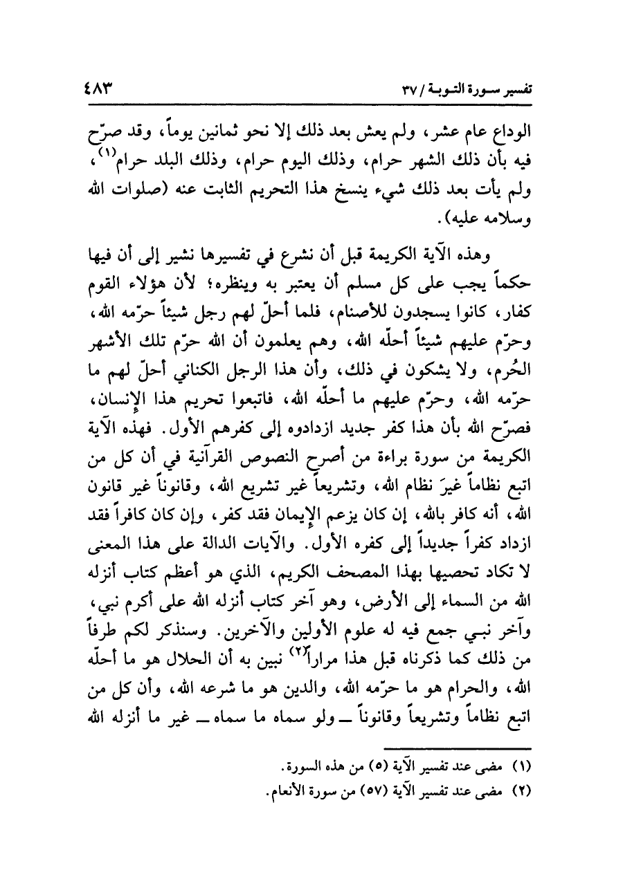 وهذه الآيةُ الكريمةُ قبلَ أن نشرعَ في تفسيرِها نشيرُ إلى أن فيها حُكْمًا يجبُ على كُلِّ مسلمٍ أن يعتبرَ به وينظرَه؛ لأن هؤلاء القومَ كفارٌ، كانوا يسجدونَ للأصنامِ، فَلَمَّا أَحَلَّ لهم رَجُلٌ شيئًا حَرَّمَهُ اللَّهُ، وَحَرَّمَ عليهم شيئًا أَحَلَّهُ اللَّهُ، وهم يعلمونَ أن اللَّهَ حرَّم تلك الأشهرَ الحُرمَ، ولا يَشُكُّونَ في ذلك، وأن هذا الرجلَ الكنانيَّ أحلَّ لهم ما حرَّمه اللَّهُ، وحرَّم عليهم ما أحلَّه اللَّهُ، فاتبعوا تحريمَ هذا الإنسانِ، فَصَرَّحَ اللَّهُ بأن هذا كفرٌ جديدٌ ازْدَادُوهُ إلى كفرِهم الأولِ. فهذه الآيةُ الكريمةُ من سورةِ براءة مِنْ أَصْرَحِ النصوصِ القرآنيةِ في أن كُلَّ مَنِ اتَّبَعَ نظامًا غيرَ نظامِ اللَّهِ، وتشريعًا غيرَ تشريعِ اللَّهِ، وقانونًا غيرَ قانونِ اللَّهِ، أنه كافرٌ بالله، إن كان يزعمُ الإيمانَ فقد كَفَرَ، وإن كان كافرًا فقد ازْدَادَ كُفْرًا جديدًا إلى كفرِه الأولِ. والآياتُ الدالةُ على هذا المعنَى لَا تكادُ تُحْصِيهَا في هذا المصحفِ الكريمِ، الذي هو أعظمُ كتابٍ أَنْزَلَهُ اللَّهُ من السماءِ إلى الأرضِ، وهو آخِرُ كتابٍ أَنْزَلَهُ اللَّهُ على أكرمِ نَبِيٍّ، وآخِرُ نَبِيٍّ جَمَعَ فيه له علومُ الأَوَّلِينَ وَالآخِرِينَ. وسنذكرُ لكم طرفًا من ذلك كما ذَكَرْنَاهُ قبلَ هذا مرارًا (¬٢) نُبَيِّنُ به أن الحلالَ هو ما أحلَّه اللَّهُ، والحرامَ هو ما حَرَّمَهُ اللَّهُ، والدينَ هو ما شَرَعَهُ اللَّهُ، وأن كُلَّ مَنِ اتَّبَعَ نظامًا وتشريعًا وقانونًا - ولو سَمَّاهُ ما سَمَّاهُ - غيرَ ما أَنْزَلَهُ اللَّهُ