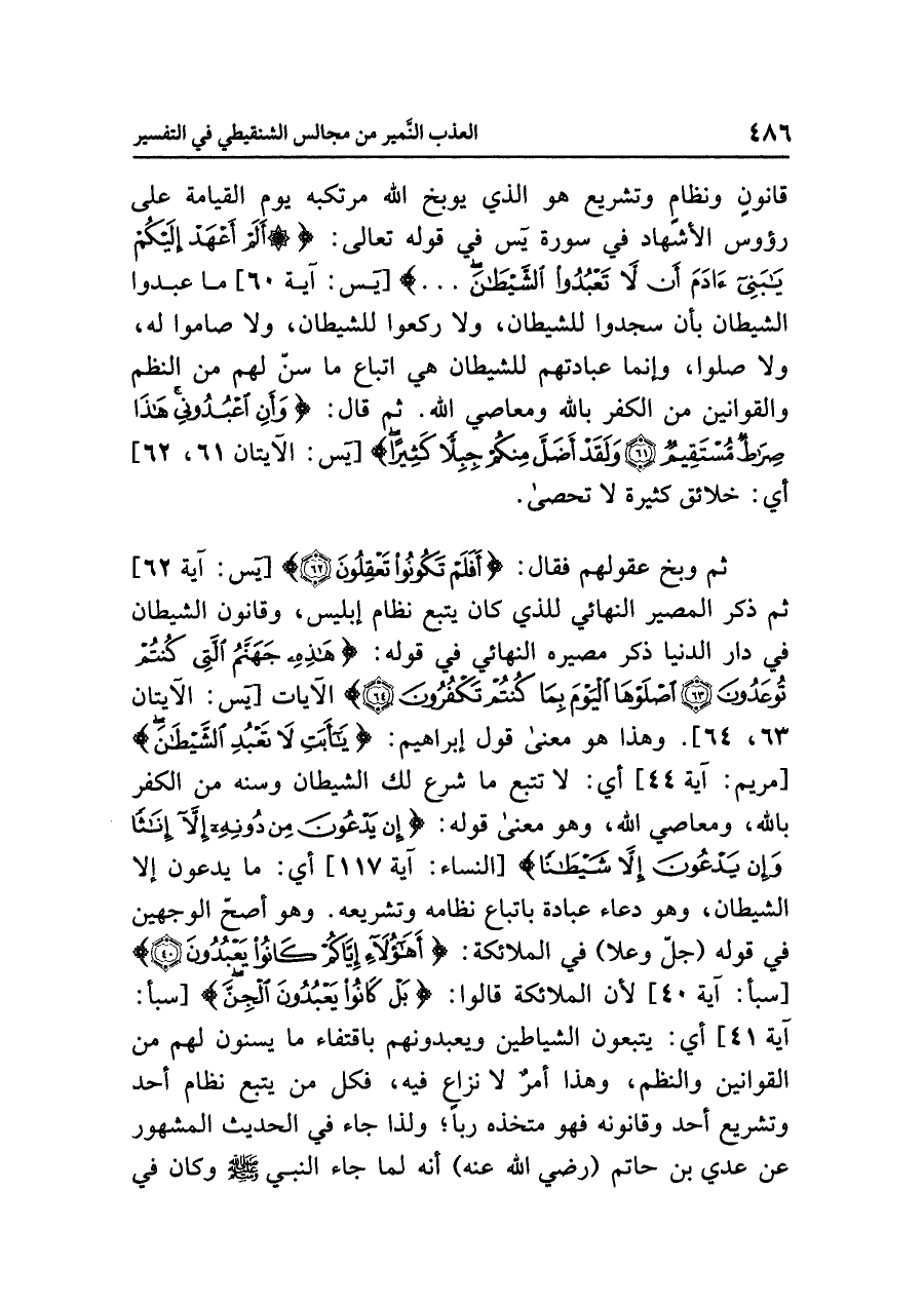 ثم وَبَّخَ عقولَهم فقال: {أَفَلَمْ تَكُونُوا تَعْقِلُونَ} [يس: آية ٦٢] ثم ذَكَرَ المصيرَ النهائيَّ للذي كان يتبعُ نظامَ إبليسَ، وقانونَ الشيطانِ في دارِ الدنيا ذَكَرَ مصيرَه النهائيَّ في قولِه: {هَذِهِ جَهَنَّمُ الَّتِي كُنْتُمْ تُوعَدُونَ (٦٣) اصْلَوْهَا الْيَوْمَ بِمَا كُنْتُمْ تَكْفُرُونَ (٦٤)} الآيات ... [يس: الآيتان ٦٣، ٦٤]. وهذا هو معنَى قولِ إبراهيمَ: {يَا أَبَتِ لَا تَعْبُدِ الشَّيْطَانَ} [مريم: آية ٤٤] أي: لا تَتَّبِعْ ما شَرَعَ لكَ الشيطانُ وَسَنَّهُ من الكفرِ باللَّه، ومعاصِي اللَّهِ، وهو معنَى قولِه: {إِنْ يَدْعُونَ مِنْ دُونِهِ إِلَاّ إِنَاثًا وَإِنْ يَدْعُونَ إِلَاّ شَيْطَانًا} [النساء: آية ١١٧] أي: ما يدعونَ إلا الشيطانَ، وهو دعاءُ عبادةٍ باتباعِ نظامِه وتشريعِه. وهو أصحُّ الْوَجْهَيْنِ في قولِه (جلَّ وعلا) في الملائكةِ: {أَهَؤُلَاءِ إِيَّاكُمْ كَانُوا يَعْبُدُونَ} [سبأ: آية ٤٠] لأن الملائكةَ قالوا: {بَلْ كَانُوا يَعْبُدُونَ الْجِنَّ} [سبأ: آية ٤١] أي: يتبعونَ الشياطينَ ويعبدونَهم باقتفاءِ ما يَسُنُّونَ لهم من القوانينَ والنظمِ، وهذا أَمْرٌ لَا نزاعَ فيه، فَكُلُّ مَنْ يتبعُ نظامَ أحدٍ وتشريعِ أحدٍ وقانونَه فهو متخذُه رَبًّا؛ ولذا جاء في الحديثِ المشهورِ عن عَدِيِّ بنِ حاتمٍ (رضي الله عنه) أنه لَمَّا جاء النبيُّ صلى الله عليه وسلم وكان في