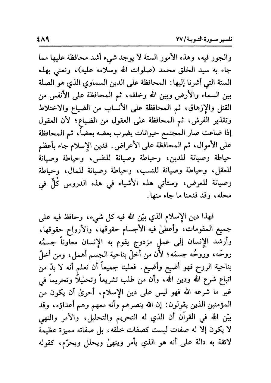 والجورُ فيه، وهذه الأمورُ الستةُ لا يوجدُ شيءٌ أشدُّ محافظةً عليها مما جاء به سيدُ الخلقِ محمدٌ (صلواتُ اللَّهِ وسلامُه عليه)، ونعني بهذه الستةِ التي أَشَرْنَا إليها: المحافظةُ على الدينِ السماويِّ الذي هو الصلةُ بينَ السماءِ والأرضِ وبينَ اللَّهِ وَخَلْقِهِ، ثم المحافظةُ على الأنفسِ من القتلِ والإزهاقِ، ثم المحافظةُ على الأنسابِ من الضياعِ والاختلاطِ وتقذيرِ الفُرُشِ، ثم المحافظةُ على العقولِ من الضياعِ؛ لأن العقولَ إذا ضَاعَتْ صار المجتمعُ حيواناتٍ يضربُ بعضُه بعضًا، ثم المحافظةُ على الأموالِ، ثم المحافظةُ على الأعراضِ. فدينُ الإسلامِ جاء بأعظمِ حياطةٍ وصيانةٍ للدينِ، وحياطة وصيانة للنفسِ، وحياطة وصيانة للعقلِ، وحياطة وصيانة للنَّسَبِ، وحياطة وصيانة للمالِ، وحياطة وصيانة للعِرْضِ، وستأتِي هذه الأشياءُ في هذه الدروسِ كُلٌّ في محلِّه، وقد قَدَّمْنَا ما جاء منها.
