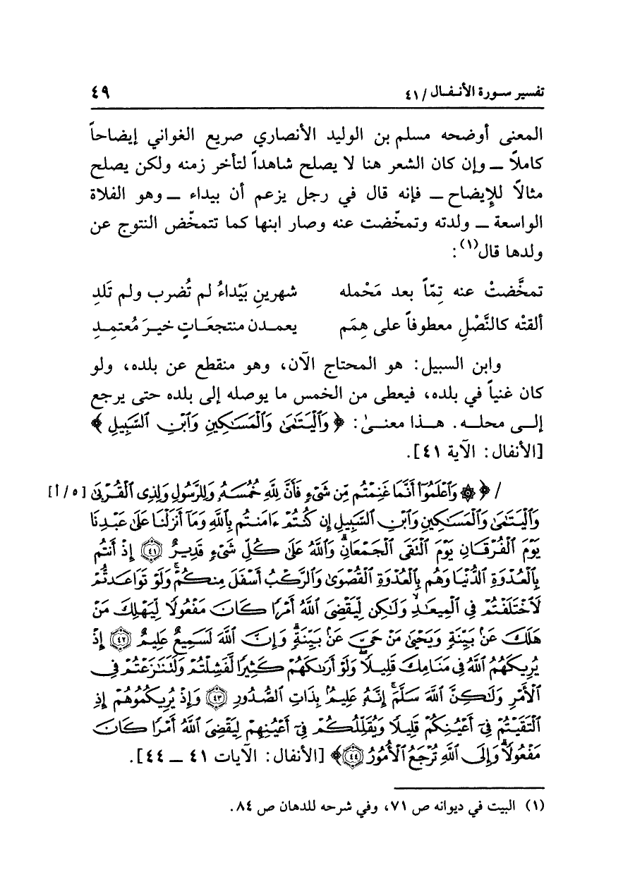 [٥/أ] / {وَاعْلَمُواْ أَنَّمَا غَنِمْتُم مِّن شَيْءٍ فَأَنَّ لِلَّهِ خُمُسَهُ وَلِلرَّسُولِ وَلِذِي الْقُرْبَى وَالْيَتَامَى وَالْمَسَاكِينِ وَابْنِ السَّبِيلِ إِن كُنتُمْ آمَنتُمْ بِاللَّهِ وَمَا أَنزَلْنَا عَلَى عَبْدِنَا يَوْمَ الْفُرْقَانِ يَوْمَ الْتَقَى الْجَمْعَانِ وَاللَّهُ عَلَى كُلِّ شَيْءٍ قَدِيرٌ (٤١) إِذْ أَنتُم بِالْعُدْوَةِ الدُّنْيَا وَهُم بِالْعُدْوَةِ الْقُصْوَى وَالرَّكْبُ أَسْفَلَ مِنكُمْ وَلَوْ تَوَاعَدتُّمْ لَاخْتَلَفْتُمْ فِي الْمِيعَادِ وَلَكِن لِّيَقْضِيَ اللَّهُ أَمْراً كَانَ مَفْعُولاً لِّيَهْلِكَ مَنْ هَلَكَ عَن بَيِّنَةٍ وَيَحْيَى مَنْ حَيَّ عَن بَيِّنَةٍ وَإِنَّ اللَّهَ لَسَمِيعٌ عَلِيمٌ (٤٢) إِذْ يُرِيكَهُمُ اللَّهُ فِي مَنَامِكَ قَلِيلاً وَلَوْ أَرَاكَهُمْ كَثِيراً لَّفَشِلْتُمْ وَلَتَنَازَعْتُمْ فِي الأَمْرِ وَلَكِنَّ اللَّهَ سَلَّمَ إِنَّهُ عَلِيمٌ بِذَاتِ الصُّدُورِ (٤٣) وَإِذْ يُرِيكُمُوهُمْ إِذِ الْتَقَيْتُمْ فِي أَعْيُنِكُمْ قَلِيلاً وَيُقَلِّلُكُمْ فِي أَعْيُنِهِمْ لِيَقْضِيَ اللَّهُ أَمْراً كَانَ مَفْعُولاً وَإِلَى اللَّهِ تُرْجَعُ الأمُورُ (٤٤)} [الأنفال: ٤١ - ٤٤].