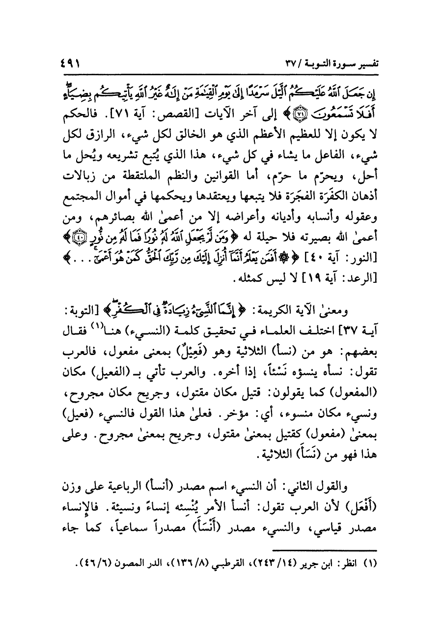 ومعنى الآيةِ الكريمةِ: {إِنَّمَا النَّسِيءُ زِيَادَةٌ فِي الْكُفْرِ} [التوبة: آية ٣٧] اختلفَ العلماءُ في تحقيقِ كلمةِ (النسيءِ) هنا (¬١) فقالَ بعضُهم: هو مِنْ (نسأ) الثلاثيةِ وهو (فَعِيلٌ) بمعنَى مفعولٍ، فالعربُ تقولُ: نساه ينسؤه نَسْئًا، إذا أَخَّرَهُ. والعربُ تأتِي بـ (الفعيل) مكانَ (المفعولِ) كما يقولونَ: قتيلٌ مكانَ مقتولٍ، وجريحٌ مكانَ مجروحٍ، ونسيءٌ مكانَ منسوءٍ، أي: مُؤَخَّرٌ. فَعَلَى هذا القولِ فالنسيءُ (فعيلٌ) بمعنَى (مفعولٍ) وكقتيلٍ بمعنَى مقتولٍ، وجريحٍ بمعنَى مجروحٍ. وعلى هذا فهو مِنْ (نَسَأَ) الثلاثيةِ.