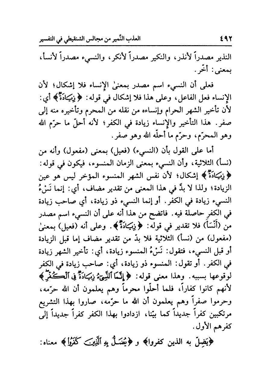 وعلى أنه (فعيلٌ) بمعنَى (مفعولٍ) مِنْ (نَسَأَ) الثلاثيةِ فلا بدَّ من تقديرِ مضافٍ إما قبلَ الزيادةِ أو قبلَ النسيءِ، فتقول: نَسْءُ المنسوءِ زيادةٌ، أي: تأخيرُ الشهرِ زيادةٌ في الكفرِ. أو تقولُ: المنسوءُ ذُو زيادةٍ، أي: صاحبُ زيادةٍ في الكفرِ لوقوعِها بسببِه. وهذا معنَى قولِه: {إِنَّمَا النَّسِيءُ زِيَادَةٌ فِي الْكُفْرِ} لأنهم كانوا كفارًا، فلما أحلُّوا مُحَرَّمًا وهم يعلمونَ أن اللَّهَ حَرَّمَهُ، وحرموا صفرًا وهم يعلمونَ أن اللَّهَ ما حَرَّمَهُ، صاروا بهذا التشريعِ مُرْتَكِبِينَ كُفْرًا جديدًا كما بَيَّنَّا، ازْدَادُوا بهذا الكفرِ كُفْرًا جديدًا إلى كُفْرِهِم الأولِ.
