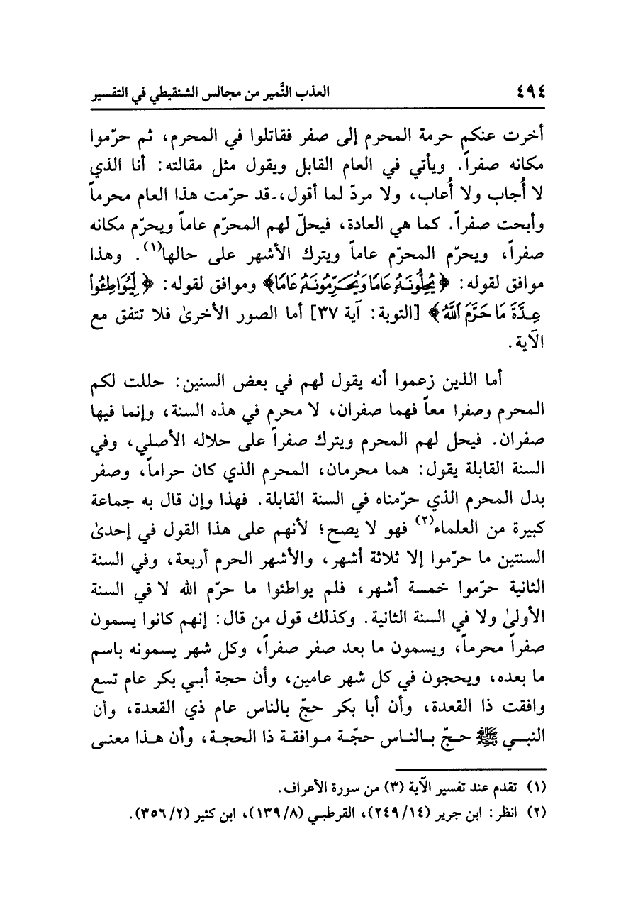 أما الذين زَعَمُوا أنه يقولُ لهم في بعضِ السنينَ: حللتُ لكم المحرمَ وَصَفَرًا معًا فَهُمَا صفرانِ، لا محرمَ في هذه السنةِ، وإنما فيها صفرانِ. فيحلُّ لهم المحرمَ ويتركُ صفرًا على حلالِه الأصليِّ، وفي السنةِ القابلةِ يقولُ: هُمَا مُحَرَّمَانِ، المحرمُ الذي كان حرامًا، وصفرٌ بدلَ المحرمِ الذي حَرَّمْنَاهُ في السنةِ القابلةِ. فهذا وإن قال به جماعةٌ كبيرةٌ من العلماءِ (¬٢) فهو لَا يصحُّ؛ لأنهم على هذا القولِ في إحدى السَّنَتَيْنِ ما حرَّموا إلا ثلاثةَ أشهرٍ، والأشهرُ الحرمُ أربعةٌ، وفي السنةِ الثانيةِ حَرَّمُوا خمسةَ أشهرٍ، فلم يُوَاطِئُوا ما حَرَّمَ اللَّهُ لَا في السنةِ الأُولَى ولا في السنةِ الثانيةِ. وكذلك قولُ مَنْ قَالَ: إنهم كانوا يُسَمُّونَ صَفَرًا مُحَرَّمًا، ويسمونَ ما بعد صفرٍ صفرًا، وكلُّ شهرٍ يسمونَه باسمِ ما بعدَه، وَيَحُجُّونَ في كُلِّ شهرٍ عَامَيْنِ، وأن حَجَّةَ أبِي بكرٍ عامَ تسعٍ، وَافَقَتْ ذَا القعدةِ، وأن أبا بكر حَجَّ بالناسِ عامَ ذِي القعدةِ، وأن النبيَّ صلى الله عليه وسلم حَجَّ بالناسِ حجَّة موافِقة ذَا الحجةِ، وأن هذا معنَى