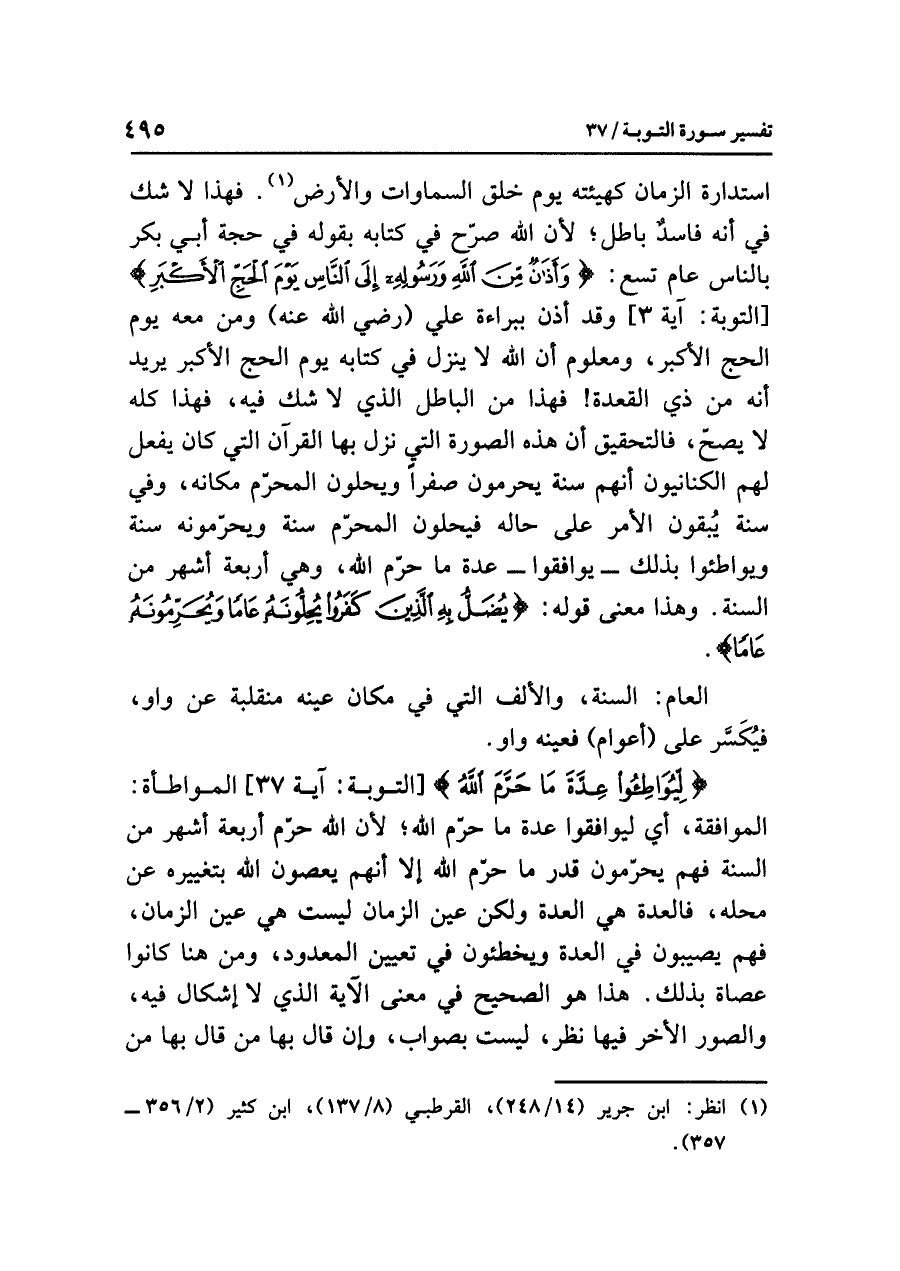 فهذا لَا شَكَّ في أنه فَاسِدٌ باطلٌ؛ لأن اللَّهَ صَرَّحَ في كتابِه بقولِه في حجةِ أبِي بكرٍ بالناسِ عامَ تِسْعٍ: {وَأَذَانٌ مِّنَ اللَّهِ وَرَسُولِهِ إِلَى النَّاسِ يَوْمَ الْحَجِّ الأَكْبَرِ} [التوبة: آية ٣] وقد أذن ببراءة عَلِيٍّ (رضي الله عنه) وَمَنْ معَه يومَ الحجِّ الأكبرِ، ومعلومٌ أن اللَّهَ لَا يُنْزِلُ في كتابِه يومَ الحجِّ الأكبرِ يريدُ أنه مِنْ ذي القعدةِ! فهذا من الباطلِ الذي لَا شَكَّ فيه، فهذا كُلُّهُ لَا يصحُّ، فالتحقيقُ أن هذه الصورةَ التي نَزَلَ بها القرآنُ التي كان يفعلُ لهم الكنانيونَ أنهم سَنَةً يُحَرِّمُونَ صَفَرًا ويحلونَ المحرَّم مكانَه، وفي سَنَةٍ يُبْقُونَ الأمرَ على حالِه فيحلونَ المحرَّم سَنَةً ويحرِّمونه سنةً ويواطئوا بذلك - يوافقوا - عدةَ ما حَرَّمَ اللَّهُ، وهي أربعةُ أشهرٍ من السنةِ. وهذا معنَى قولِه: {يُضَلُّ بِهِ الَّذِينَ كَفَرُوا يُحِلِّونَهُ عَامًا وَيُحَرِّمُونَهُ عَامًا}.