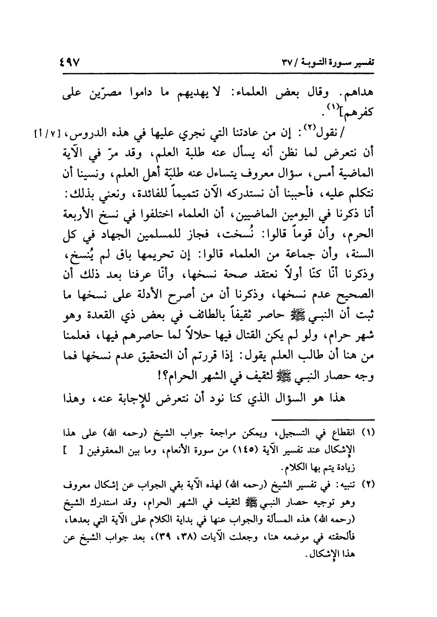 (¬٢) تنبيه: في تفسير الشيخ (رحمه الله) لهذه الآية بقي الجواب عن إشكال معروف وهو توجيه حصار النبي صلى الله عليه وسلم لثقيف في الشهر الحرام. وقد استدرك الشيخ (رحمه الله) هذه المسألة والجواب عنها في بداية الكلام على الآية التي بعدها، فألحقته في موضعه هنا، وجعلت الآيات (٣٨، ٣٩)، بعد جواب الشيخ عن هذا الإشكال.