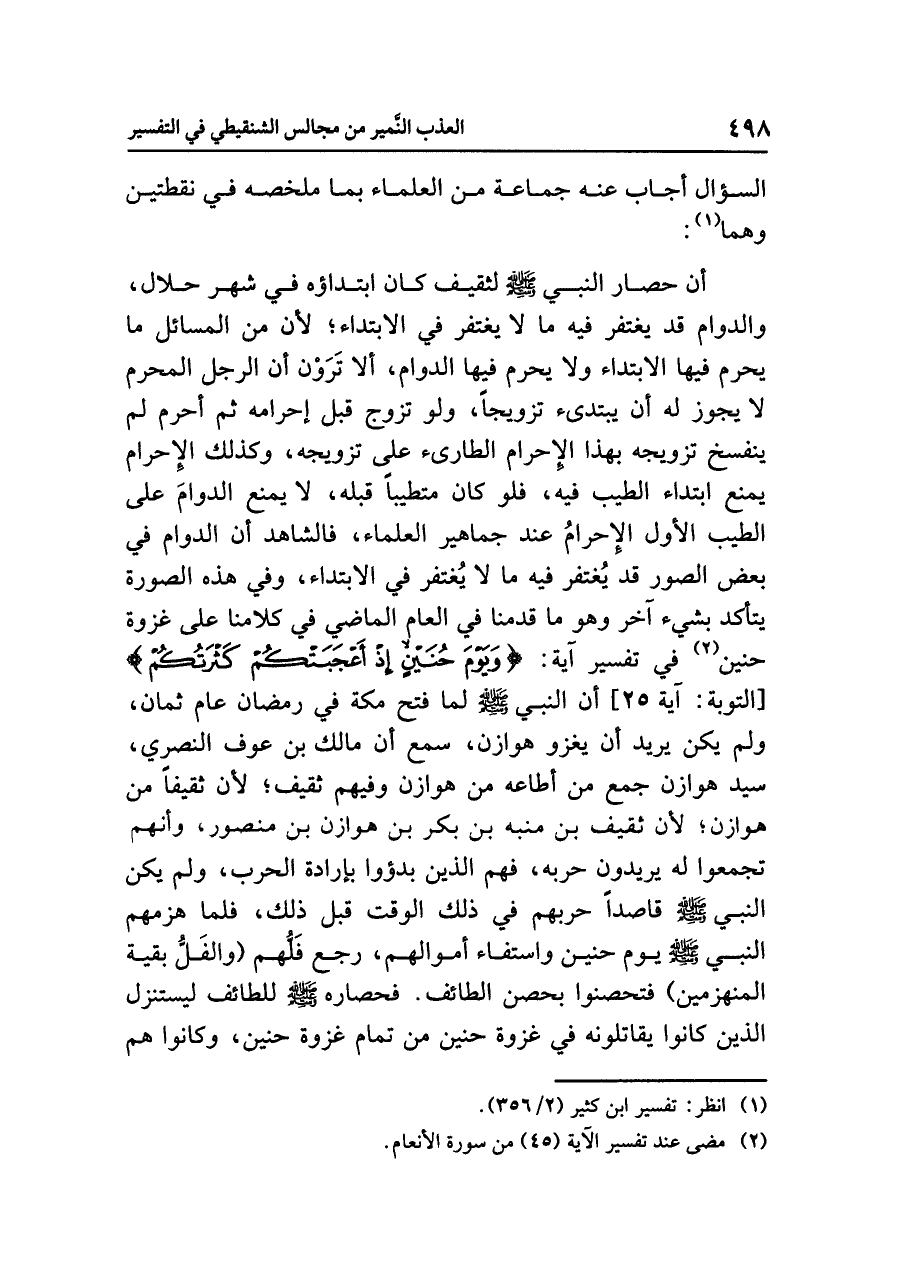 أن حصارَ النبيِّ صلى الله عليه وسلم لثقيفٍ كان ابتداؤُه في شهرٍ حلالٍ، والدوامُ قد يغتفرُ فيه ما لا يغتفرُ في الابتداءِ؛ لأن مِنَ المسائلِ ما يُحَرَّمُ فيها الابتداءُ ولا يحرمُ فيها الدوامُ، ألا تَرَوْنَ أن الرجلَ الْمُحْرِمَ لا يجوزُ له أن يبتدئَ تزويجًا، ولو تزوجَ قبل إحرامِه ثم أَحْرَمَ لم يَنْفَسِخْ تزويجُه بهذا الإحرامِ الطارئِ على تزويجِه، وكذلك الإحرامُ يُمْنَعُ ابتداءُ الطِّيبِ فيه، فلو كان مُتَطَيِّبًا قبلَه، لَا يمنعُ الدوامَ على الطِّيبِ الأولِ الإحرامُ عندَ جماهيرِ العلماءِ، فالشاهدُ أن الدوامَ في بعضِ الصورِ قد يُغْتَفَرُ فيه ما لا يُغتفر في الابتداءِ، وفي هذه الصورةِ يتأكدُ بشيءٍ آخَرَ وهو ما قَدَّمْنَا في كلامِنا على غزوةِ حُنَيْنٍ (¬٢) في تفسيرِ آيةِ: {وَيَوْمَ حُنَيْنٍ إِذْ أَعْجَبَتْكُمْ كَثْرَتُكُمْ} [التوبة: آية ٢٥] أن النبيَّ صلى الله عليه وسلم لَمَّا فَتَحَ مكةَ في رمضانَ عامَ ثمانٍ، ولم يكن يريدُ أن يغزوَ هوازنَ، سَمِعَ أن مالكَ بنَ عوفٍ النصريَّ، سيدَ هوازنَ جَمَعَ مَنْ أَطَاعَهُ من هوازنَ وفيهم ثقيفٌ؛ لأن ثقيفًا من هوازنَ؛ لأن ثقيفَ بْنَ منبهِ بنِ بكرِ بنِ هوازنَ بنِ منصورٍ، وأنهم تَجَمَّعُوا له يريدونَ حربَه، فَهُمُ الذينَ بدؤوا بإرادةِ الحربِ، ولم يَكُنِ النبيُّ صلى الله عليه وسلم قَاصِدًا حربَهم في ذلك الوقتِ قبلَ ذلك، فَلَمَّا هَزَمَهُمُ النبيُّ صلى الله عليه وسلم يومَ حنينٍ واستفاءَ أموالَهم، رَجَعَ فَلُّهُمْ (والفَلُّ بقيةُ المنهزمينَ) فَتَحَصَّنُوا بحصنِ الطائفِ.